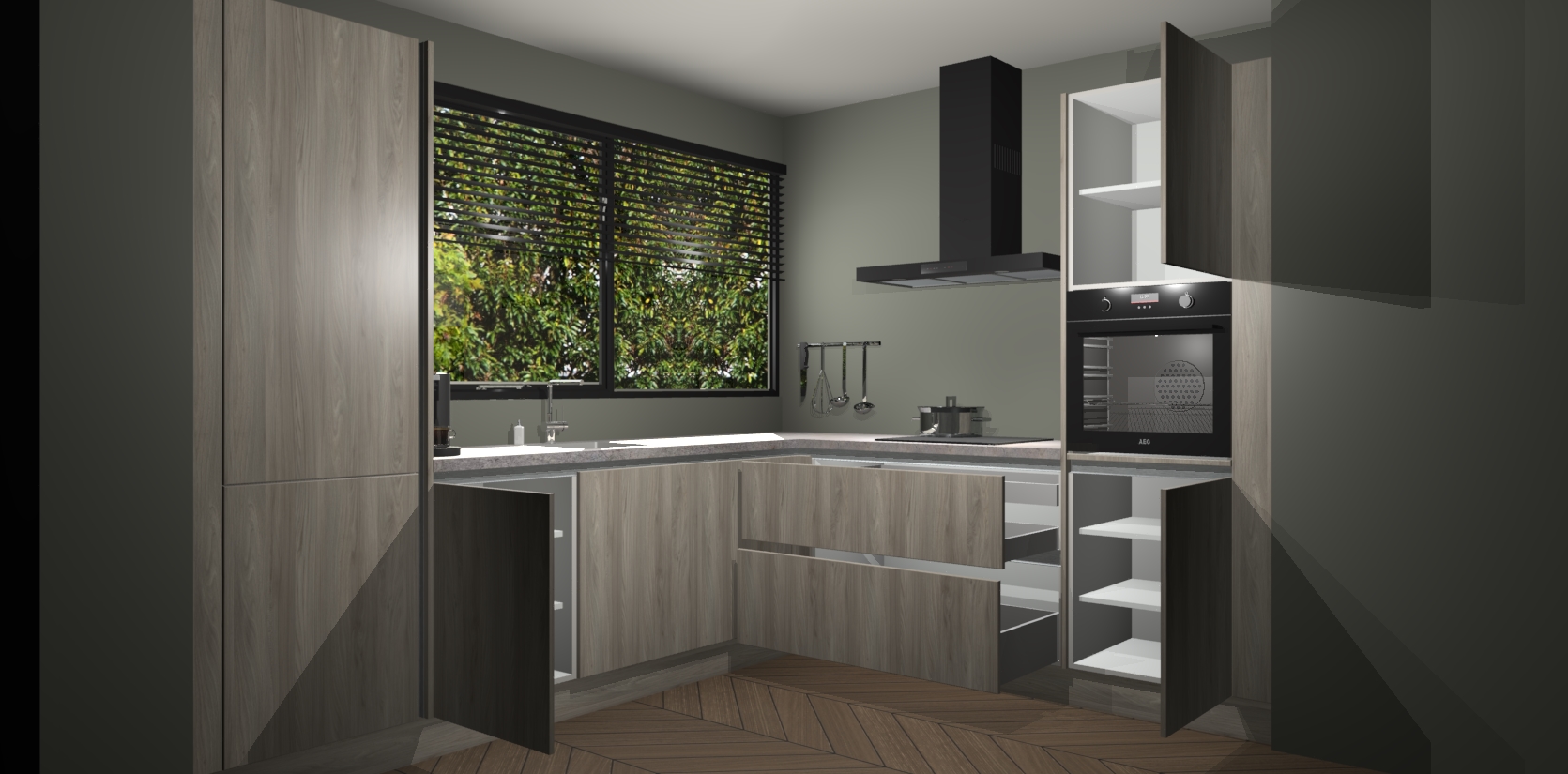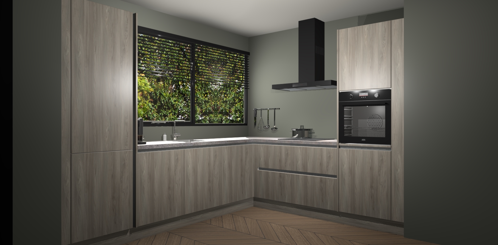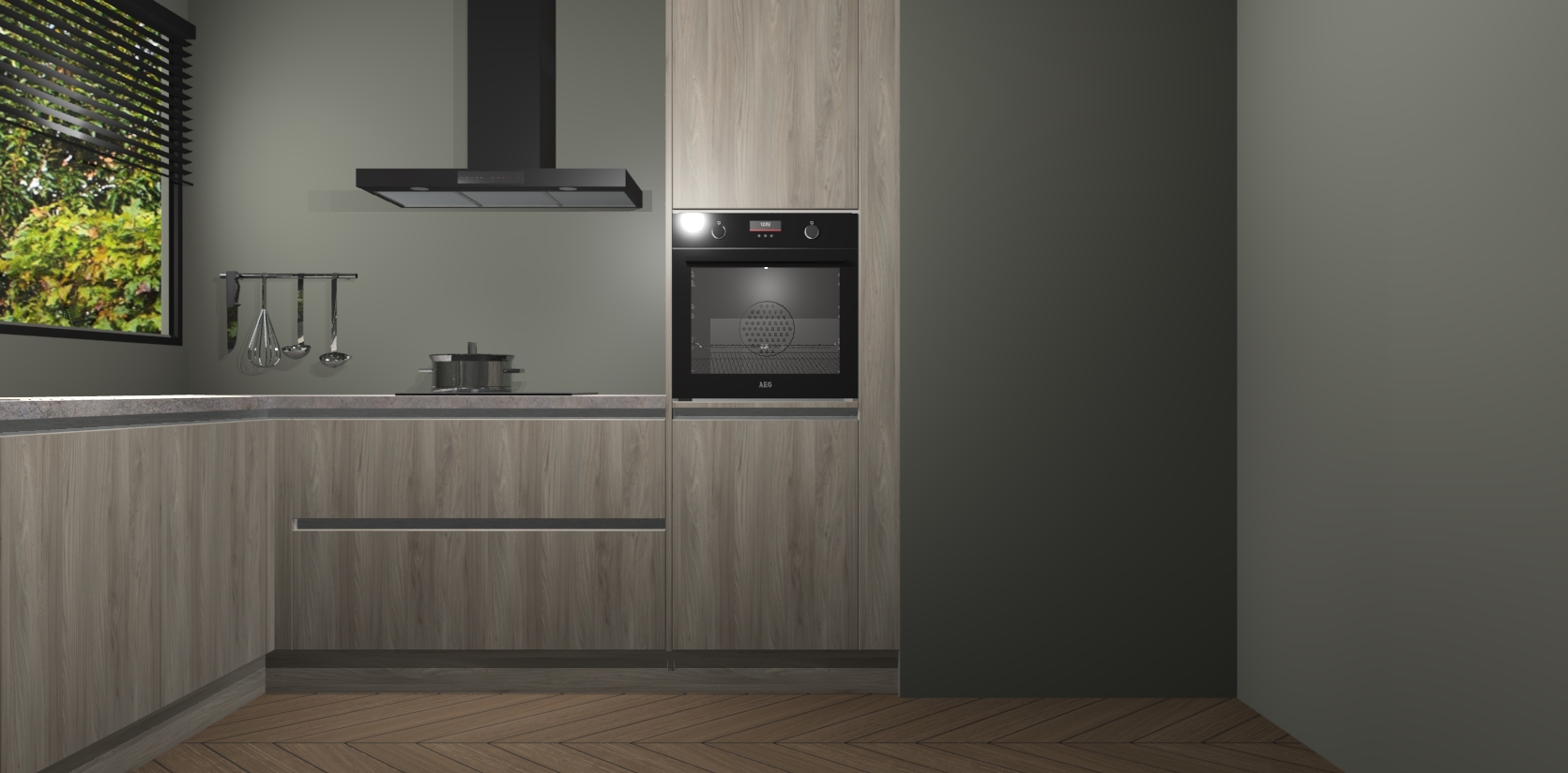 Met een modern, tijdloos design en ruime opslagruimte, zult u zich in no-time thuis voelen in uw nieuwe keuken. Uw leven wordt eenvoudiger met de soft-close deuren die voor het ultieme stille comfort zorgen - geen geluid dat u stoort terwijl u kookt. Ook is de keuken voorzien van 5 ingebouwde apparaten: een oven, inductie kookplaat, afzuigkap, vaatwasser en koelkast. Deze kunnen gemakkelijk na bestelling worden bijgewerkt naar AEG - waardoor uw luxe ervaring compleet is.