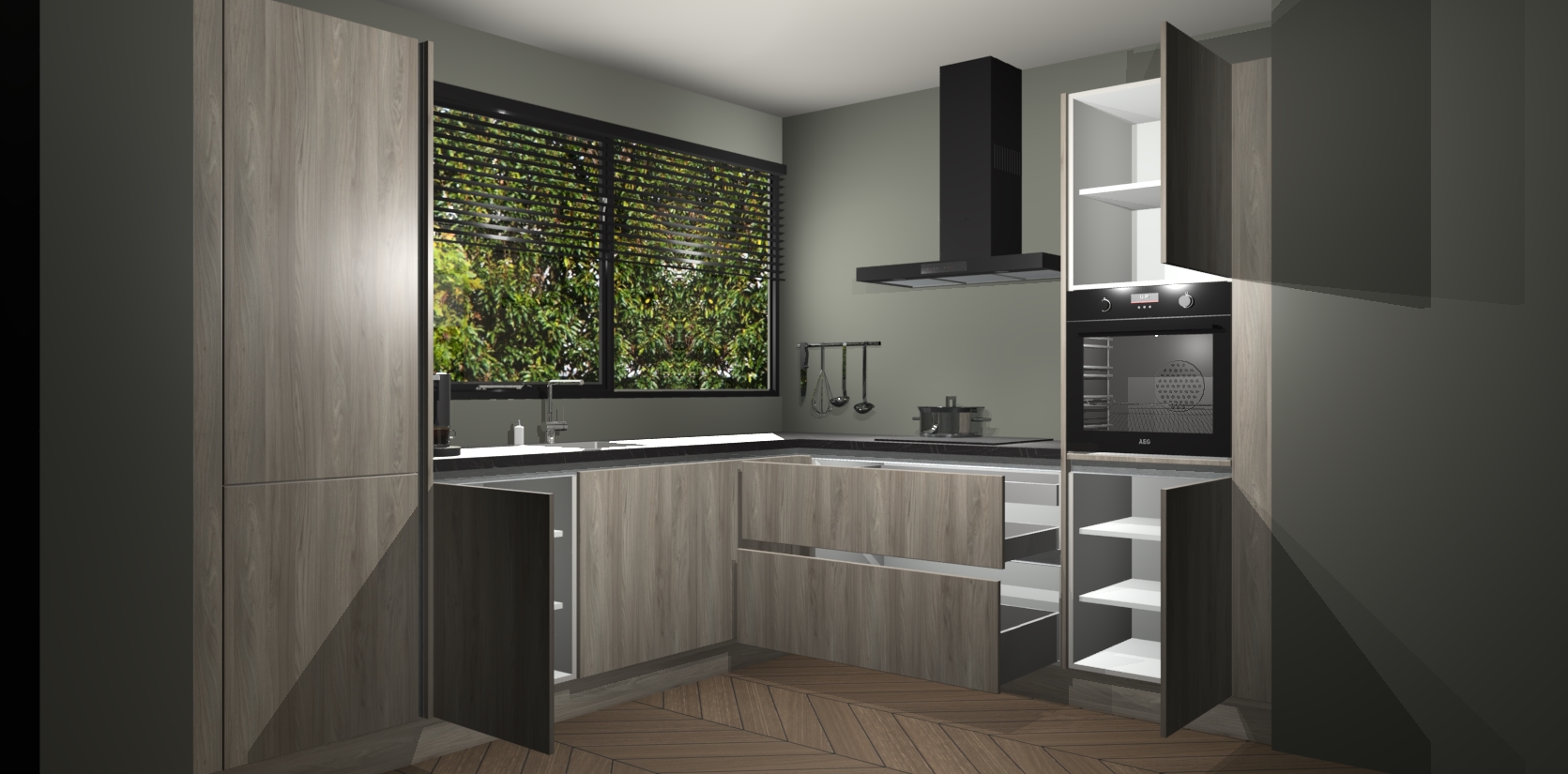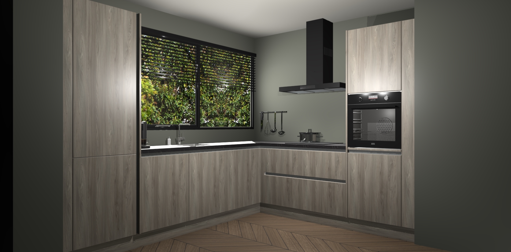 Met een modern, tijdloos design en ruime opslagruimte, zult u zich in no-time thuis voelen in uw nieuwe keuken. Uw leven wordt eenvoudiger met de soft-close deuren die voor het ultieme stille comfort zorgen - geen geluid dat u stoort terwijl u kookt. Ook is de keuken voorzien van 5 ingebouwde apparaten: een oven, inductie kookplaat, afzuigkap, vaatwasser en koelkast. Deze kunnen gemakkelijk na bestelling worden bijgewerkt naar AEG - waardoor uw luxe ervaring compleet is.