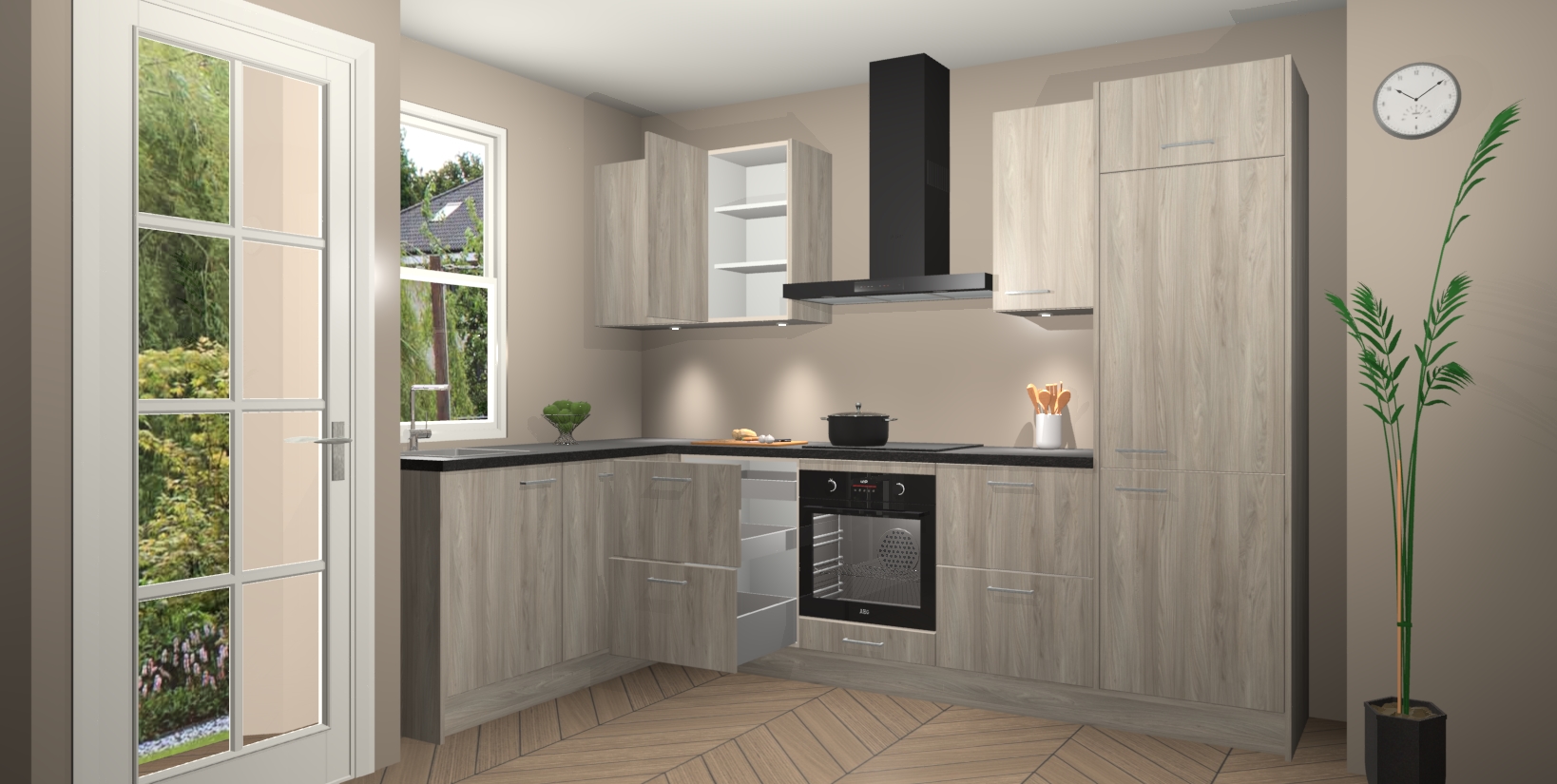 Bent u op zoek naar een strakke, moderne hoekkeuken die uw huis oppept en een moderne uitstraling geeft? Kijk dan niet verder dan de olm keuken Beijing. Deze verbluffende hoekkeuken tilt hedendaags design naar een hoger niveau. Qua stijl is deze chique hoekkeuken voorzien van olm accenten, om een strakke maar opvallende look te creëren. De binnenkant van de kasten is afgewerkt in dezelfde prachtige olm kleur voor extra esthetische aantrekkingskracht.