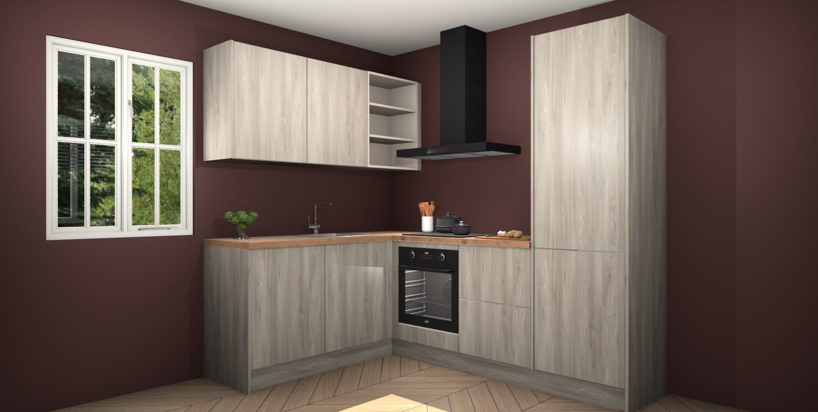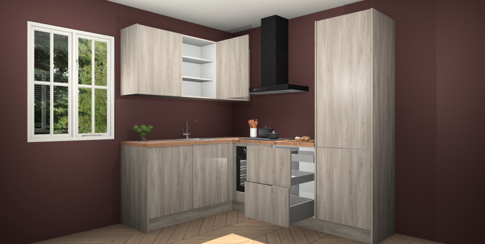 Maak kennis met de Olm keuken Boekarest, een moderne hoekkeuken waar al uw vrienden en familie jaloers op zullen zijn! Het verbluffende mooie ontwerp past in elk interieur en is een ideale keuze voor wie op zoek is naar een klassieke, maar verfijnde look.