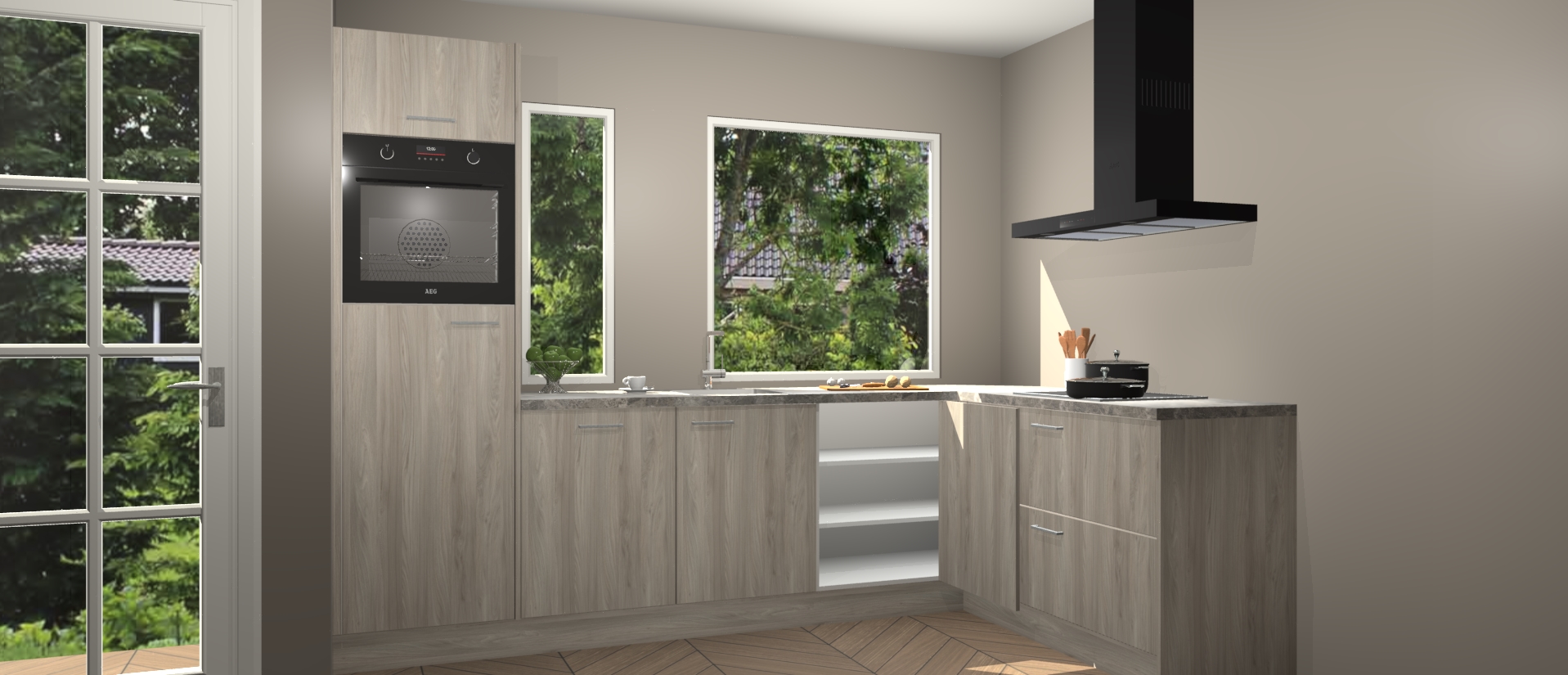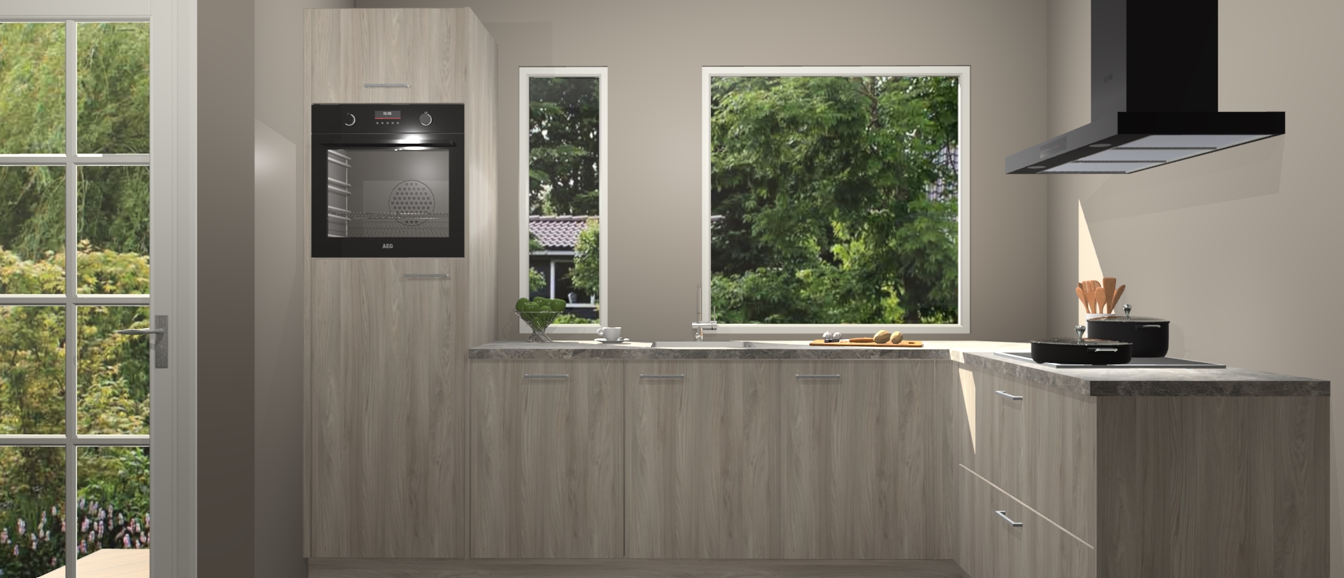 Deze complete keuken wordt geleverd met 5 inbouwapparaten: een oven, inductiekookplaat, afzuigkap, vaatwasser en koelkast. De toestellen kunnen na bestelling ook gemakkelijk worden opgewaardeerd naar AEG. Bovendien is elke deur in deze keuken voorzien van handige softclose technologie voor eenvoudig gebruik! Als een leuke toevoeging zit in deze keuken ook een carrousel, zo hoef je niet meer de hoek in duiken om iets te pakken.