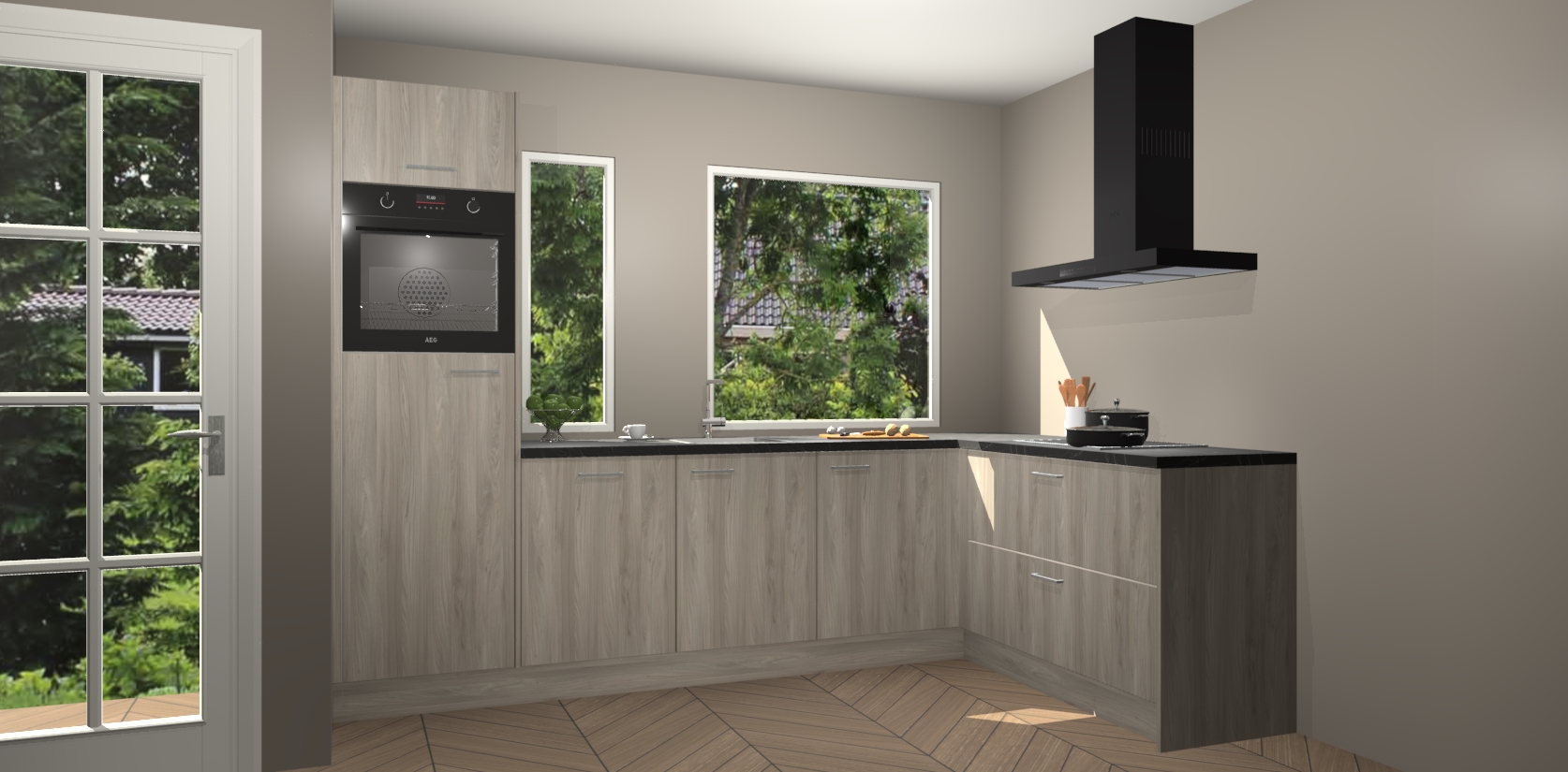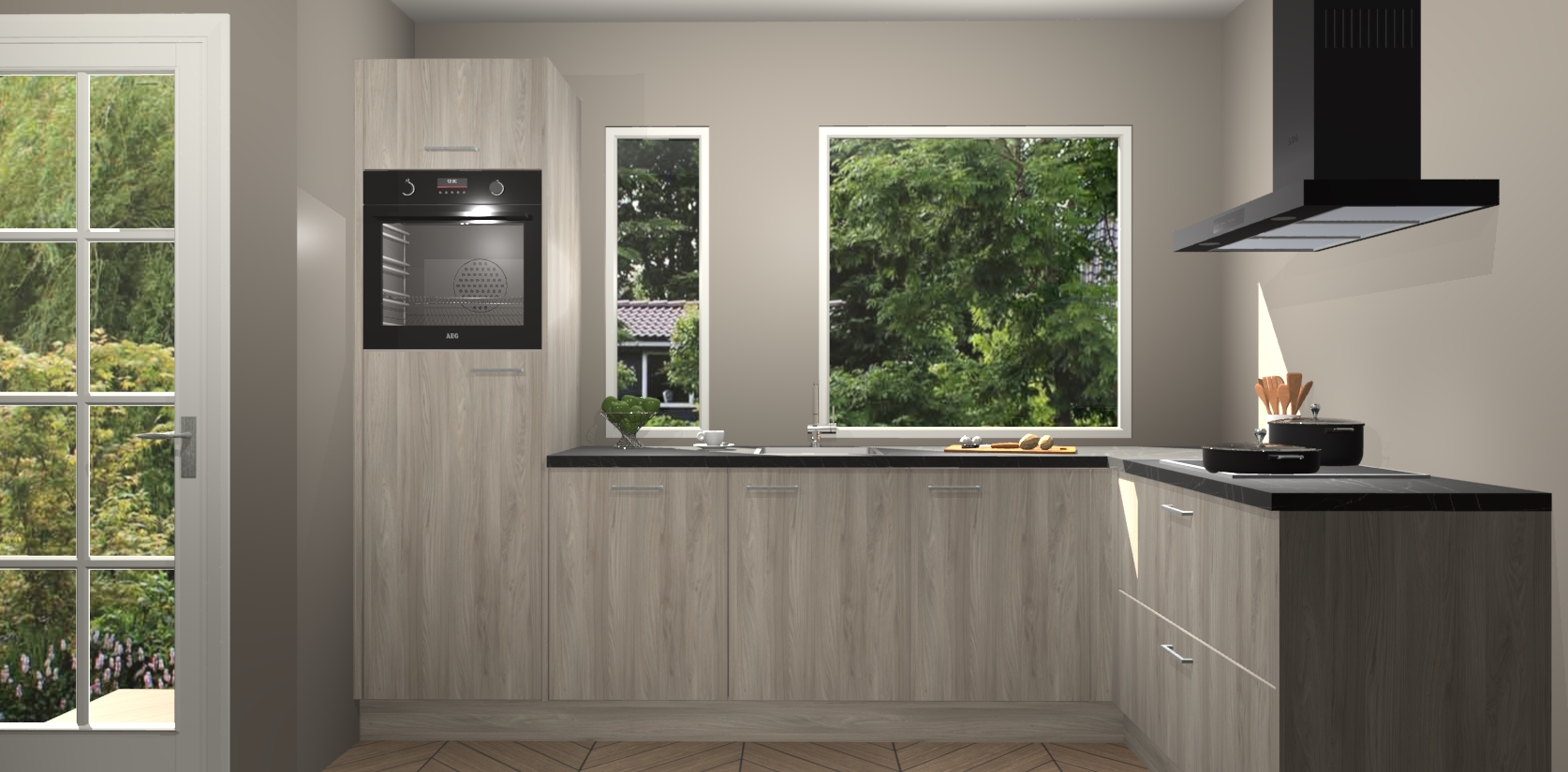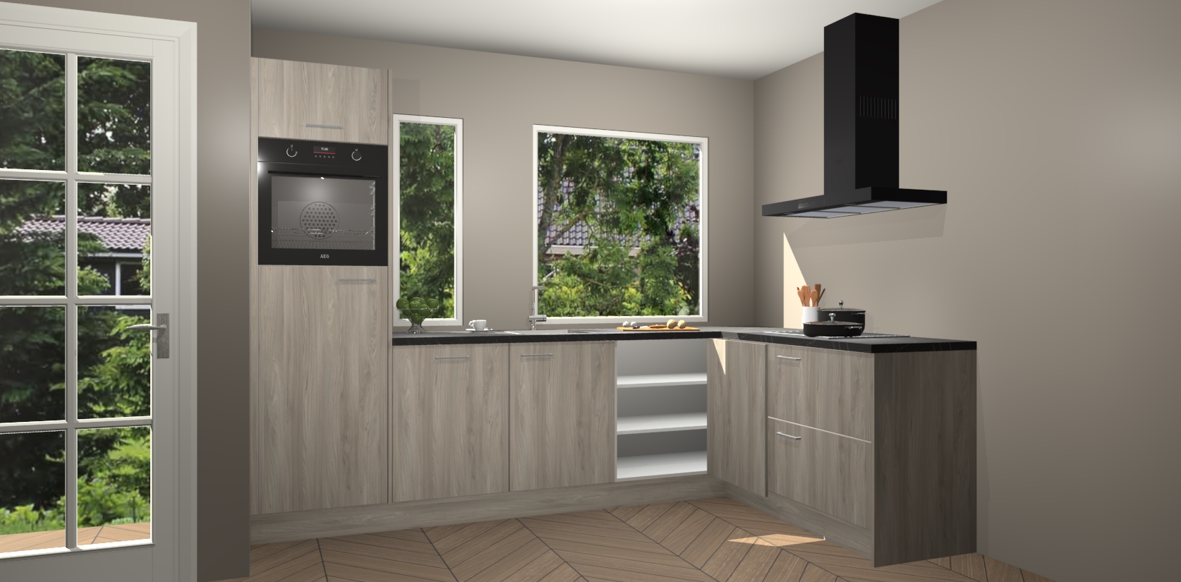 Deze complete keuken wordt geleverd met 5 inbouwapparaten: een oven, inductiekookplaat, afzuigkap, vaatwasser en koelkast. De toestellen kunnen na bestelling ook gemakkelijk worden opgewaardeerd naar AEG. Bovendien is elke deur in deze keuken voorzien van handige softclose technologie voor eenvoudig gebruik! Als een leuke toevoeging zit in deze keuken ook een carrousel, zo hoef je niet meer de hoek in duiken om iets te pakken.