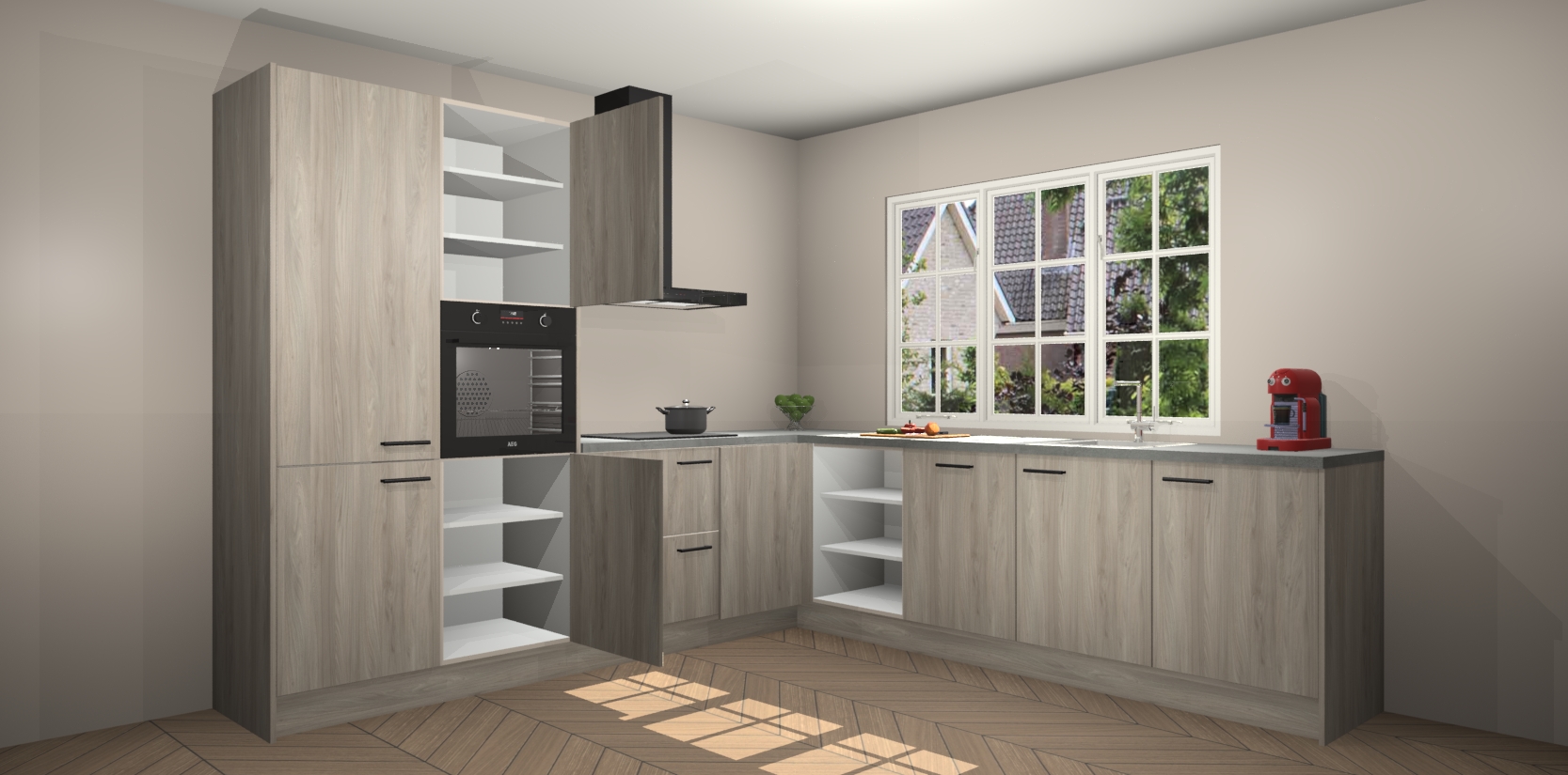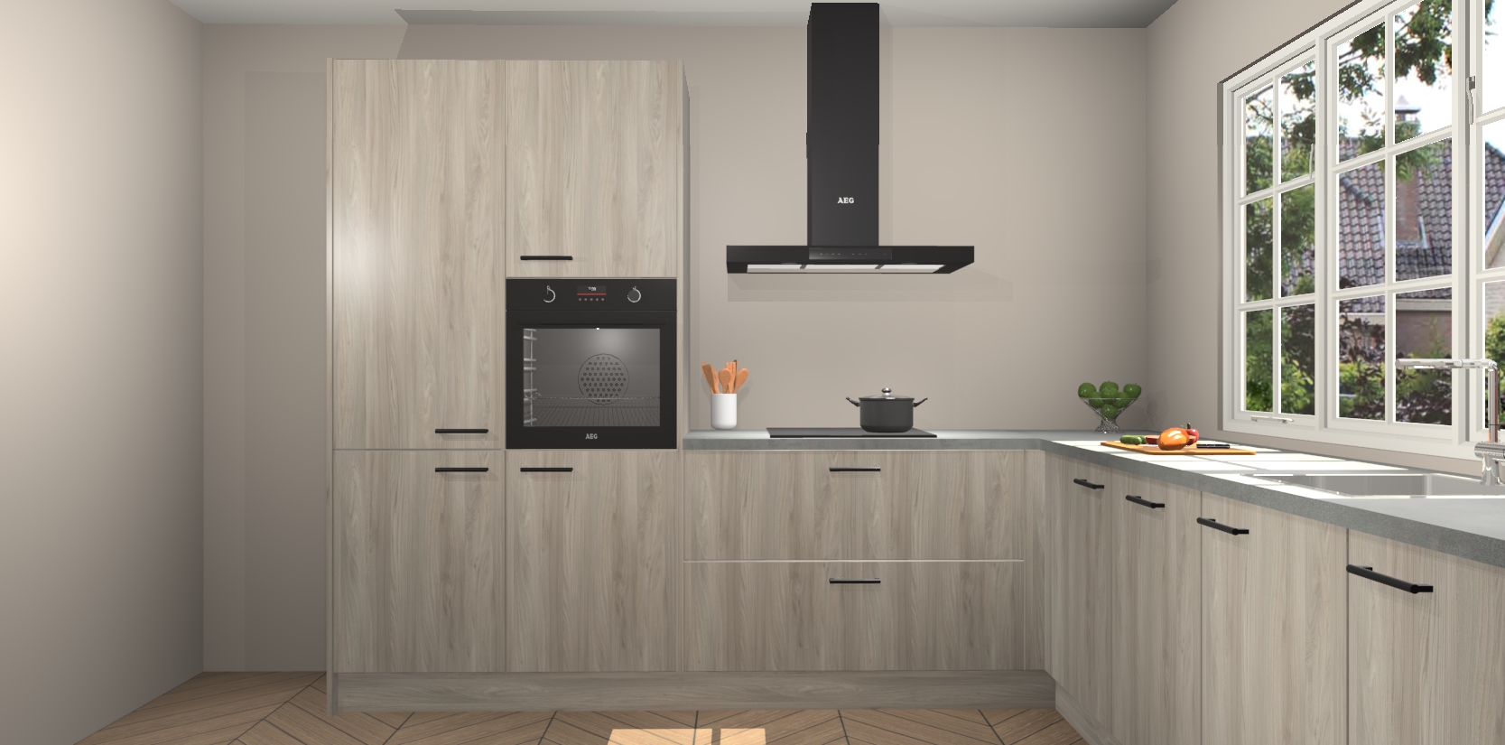 De keuken heeft veel opbergruimte, waardoor u alle ingrediënten gemakkelijk bereikbaar hebt staan. En daarnaast bevat deze volledig uitgeruste keuken ook 5 ingebouwde apparaten: een oven, inductiekookplaat, afzuigkap, vaatwasser en koelkast. Deze zijn heel eenvoudig na bestellen te upgraden naar AEG als u dit wilt. Bovendien zijn de softclose-kastdeuren ideaal; geef ze gewoon even een tikje en ze sluiten automatisch met geruisloze precisie.