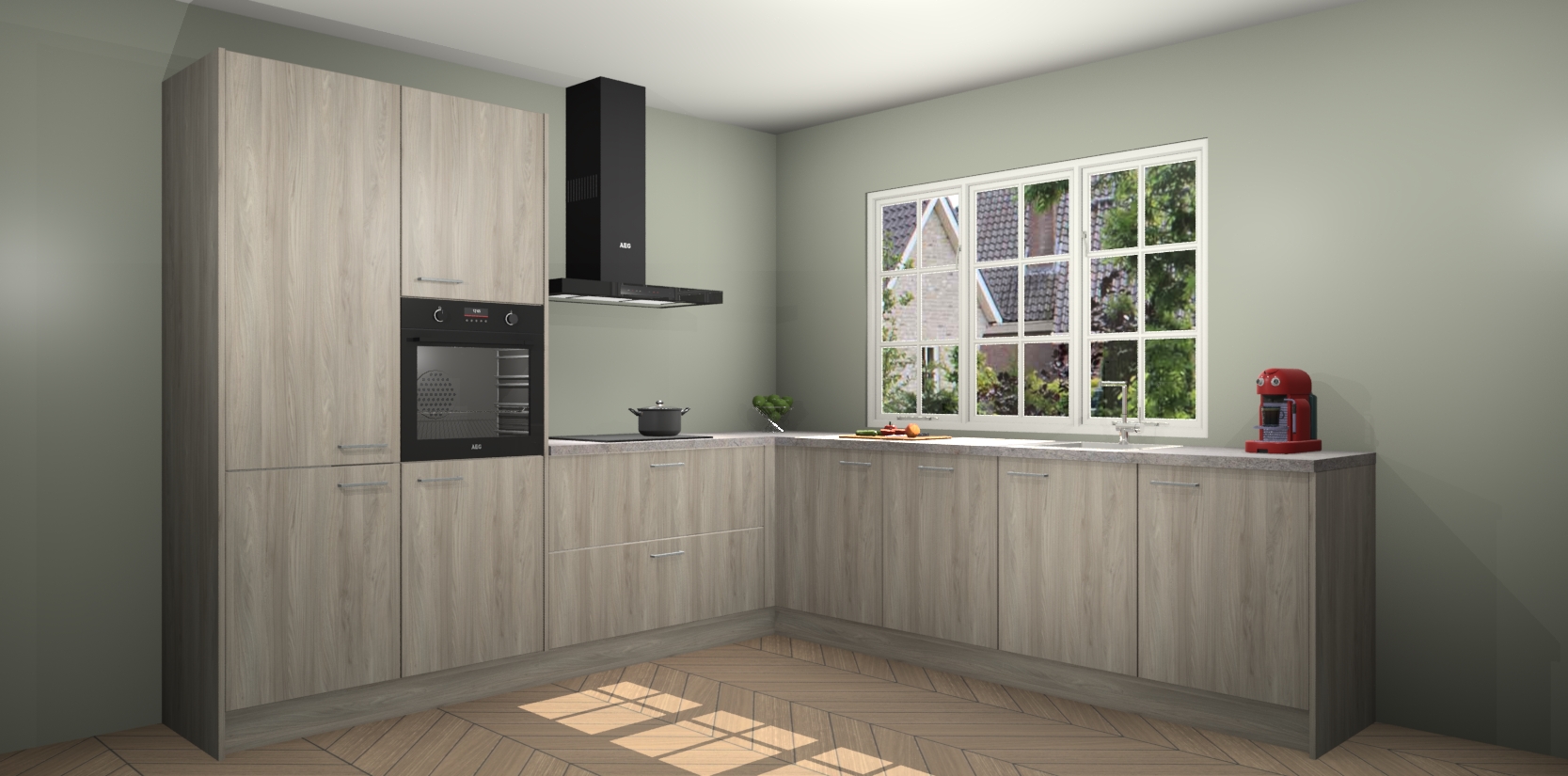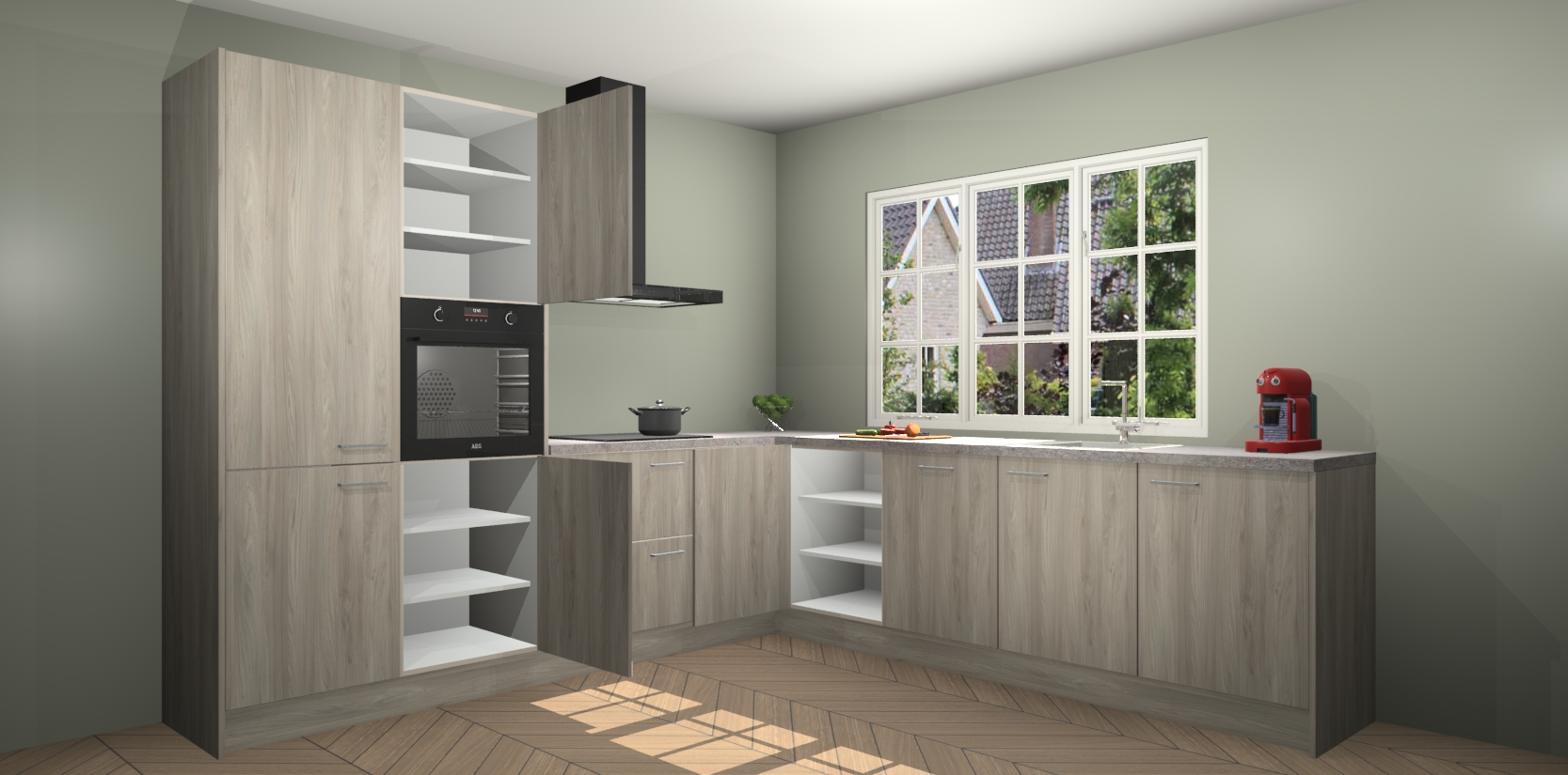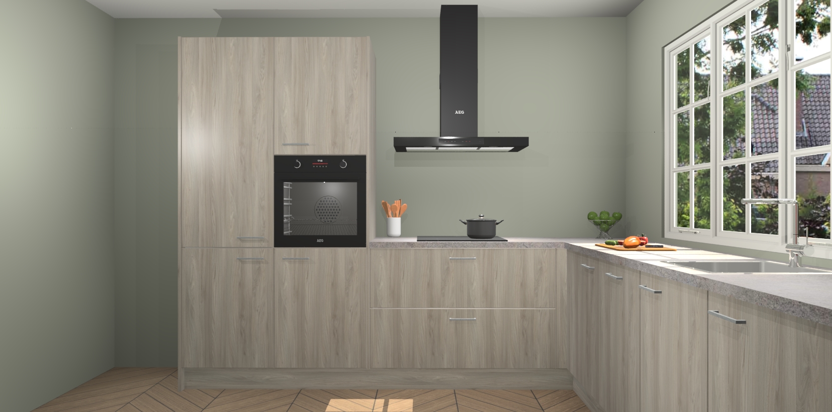 De keuken heeft veel opbergruimte, waardoor u alle ingrediënten gemakkelijk bereikbaar hebt staan. En daarnaast bevat deze volledig uitgeruste keuken ook 5 ingebouwde apparaten: een oven, inductiekookplaat, afzuigkap, vaatwasser en koelkast. Deze zijn heel eenvoudig na bestellen te upgraden naar AEG als u dit wilt. Bovendien zijn de softclose-kastdeuren ideaal; geef ze gewoon even een tikje en ze sluiten automatisch met geruisloze precisie.