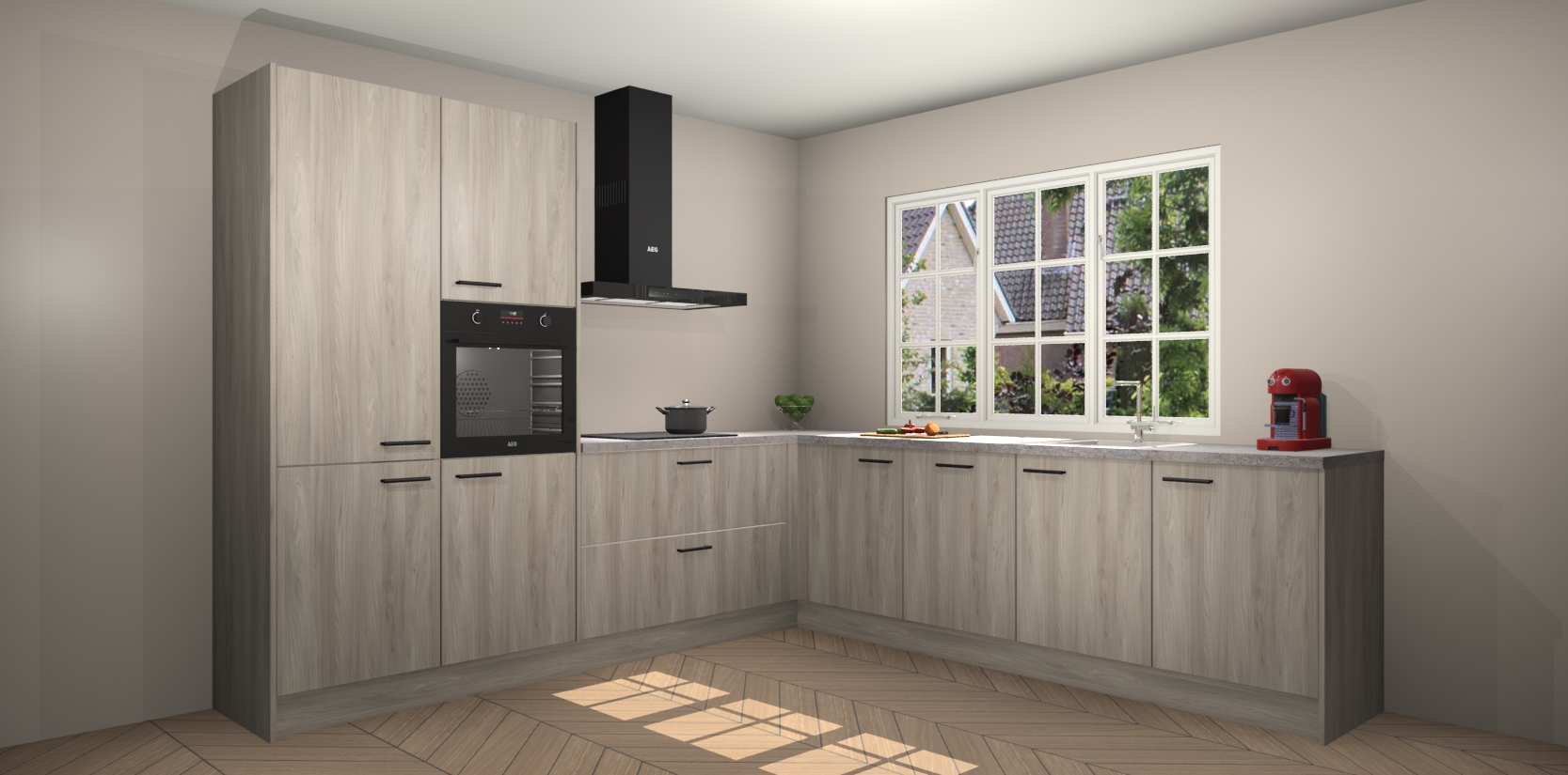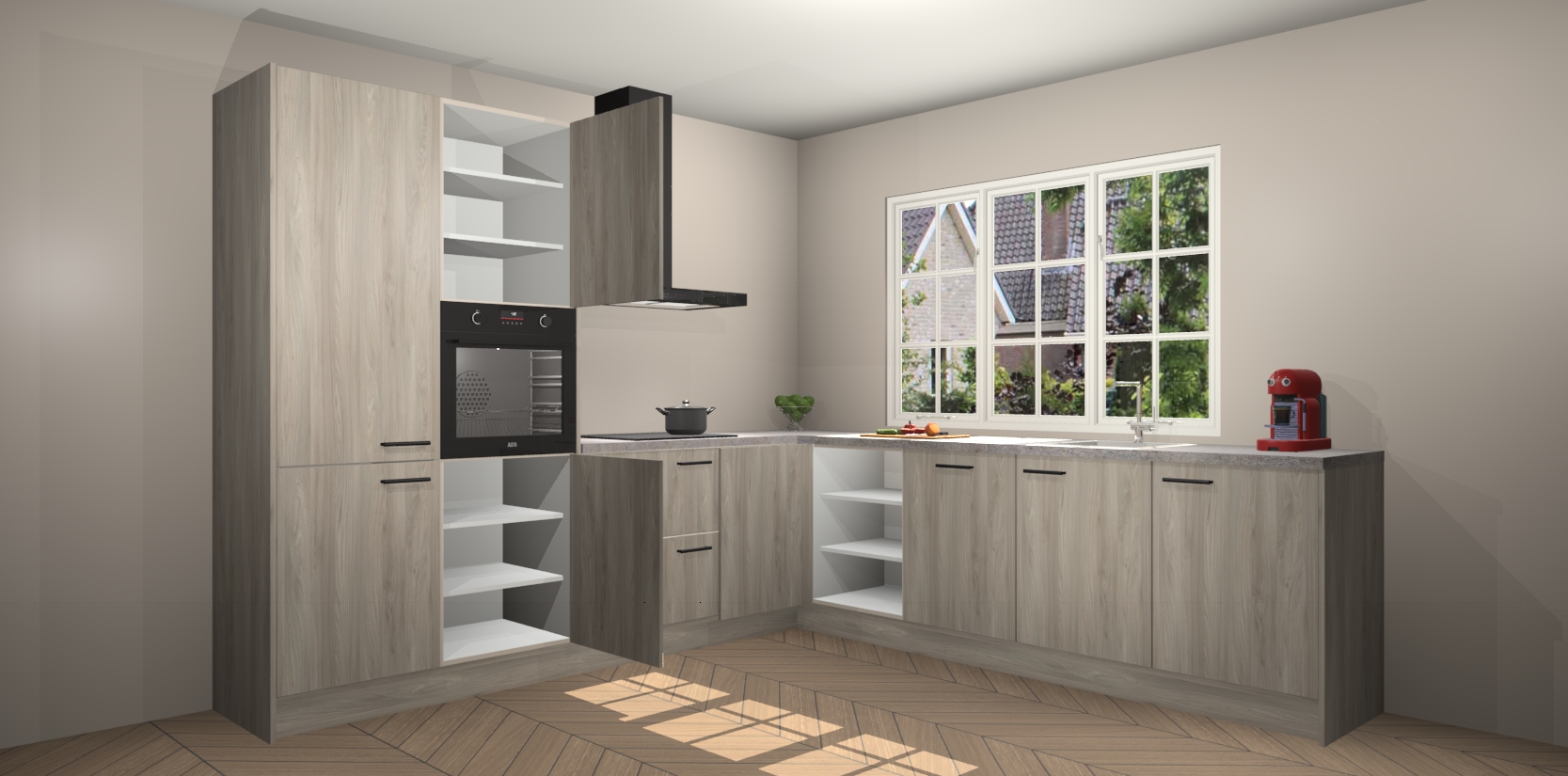 De keuken heeft veel opbergruimte, waardoor u alle ingrediënten gemakkelijk bereikbaar hebt staan. En daarnaast bevat deze volledig uitgeruste keuken ook 5 ingebouwde apparaten: een oven, inductiekookplaat, afzuigkap, vaatwasser en koelkast. Deze zijn heel eenvoudig na bestellen te upgraden naar AEG als u dit wilt. Bovendien zijn de softclose-kastdeuren ideaal; geef ze gewoon even een tikje en ze sluiten automatisch met geruisloze precisie.