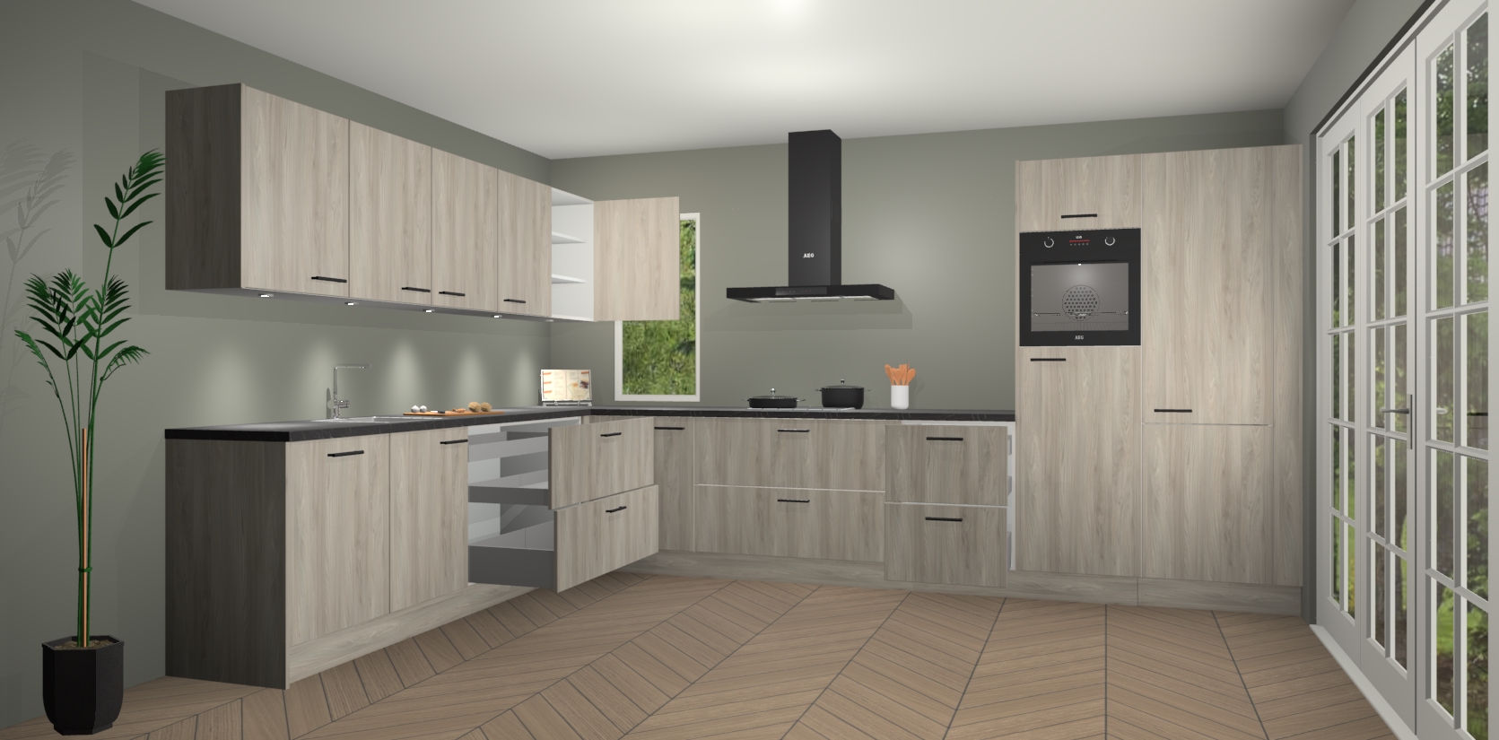 Kom dichtbij de perfecte keuken van uw dromen met de olm keuken Harare. Met een prachtige houtlook en eigentijds ontwerp, straalt deze keuken warmte en sfeer uit. Of u nu liefhebber bent van traditionele of moderne stijlen, er is genoeg ruimte om aan al uw behoeften te voldoen.