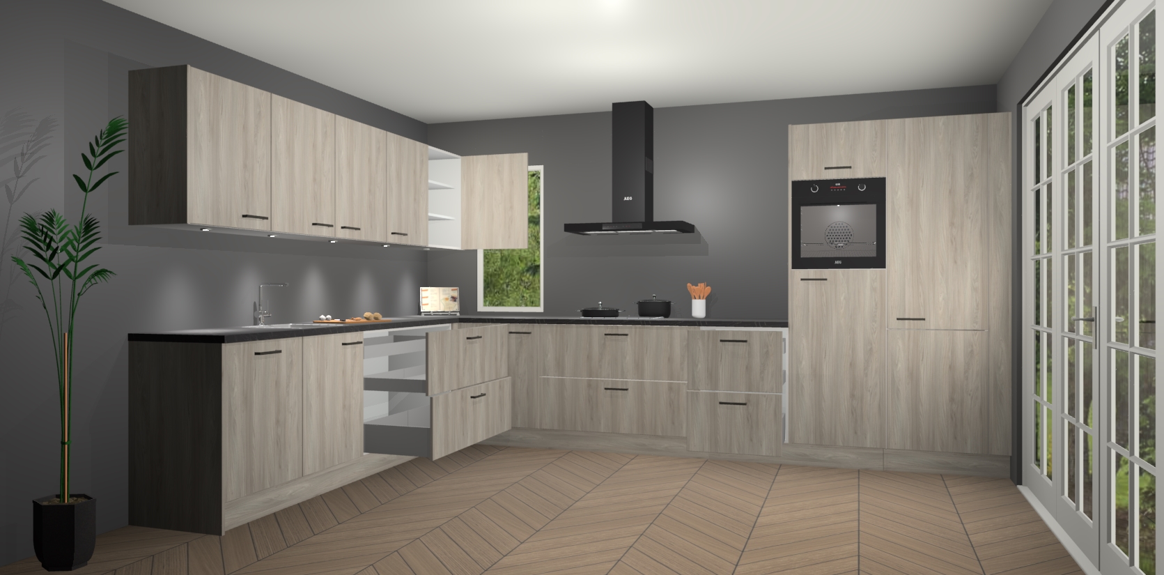 Kom dichtbij de perfecte keuken van uw dromen met de olm keuken Harare. Met een prachtige houtlook en eigentijds ontwerp, straalt deze keuken warmte en sfeer uit. Of u nu liefhebber bent van traditionele of moderne stijlen, er is genoeg ruimte om aan al uw behoeften te voldoen.
