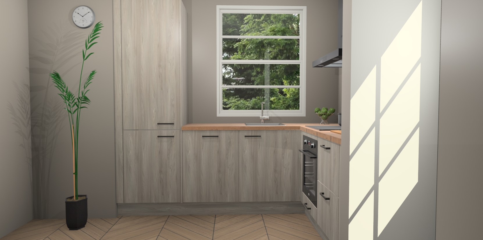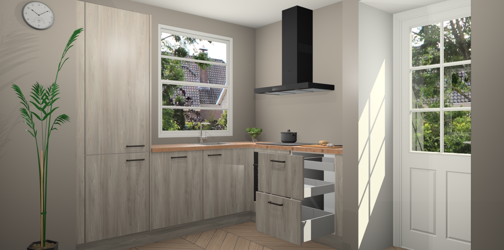 Wilt u een echte aanwinst voor uw keuken, maar bent u op zoek naar iets specialers dan de standaardkeukens? Kies dan voor de Olm keuken Harbin! Dit prachtige hoekkeukenontwerp geeft u alle ruimte om optimaal te genieten van heerlijk koken. Het uitmuntende afwerkingsniveau, de fraaie houtstructuur en de sfeervolle zwarte grepen maken van de Olm keuken Harbin de perfecte keuze voor zowel enthousiaste thuiskoks als design-minded interieurliefhebbers.
