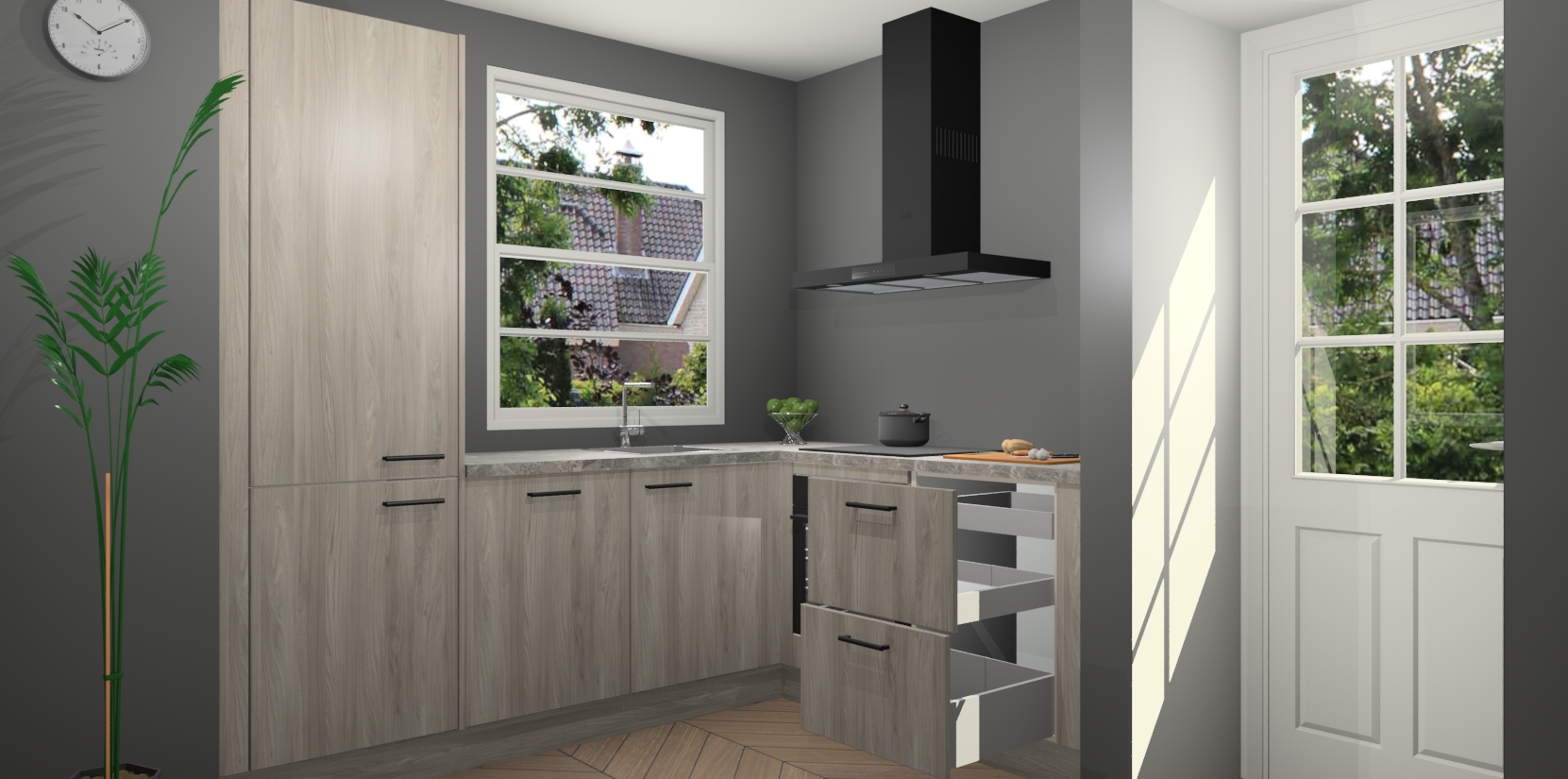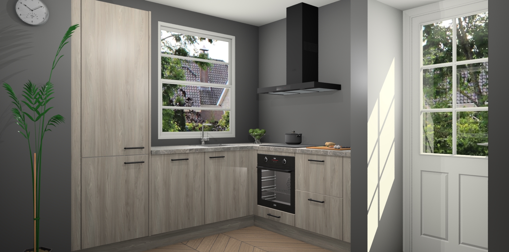 Wilt u een echte aanwinst voor uw keuken, maar bent u op zoek naar iets specialers dan de standaardkeukens? Kies dan voor de Olm keuken Harbin! Dit prachtige hoekkeukenontwerp geeft u alle ruimte om optimaal te genieten van heerlijk koken. Het uitmuntende afwerkingsniveau, de fraaie houtstructuur en de sfeervolle zwarte grepen maken van de Olm keuken Harbin de perfecte keuze voor zowel enthousiaste thuiskoks als design-minded interieurliefhebbers.