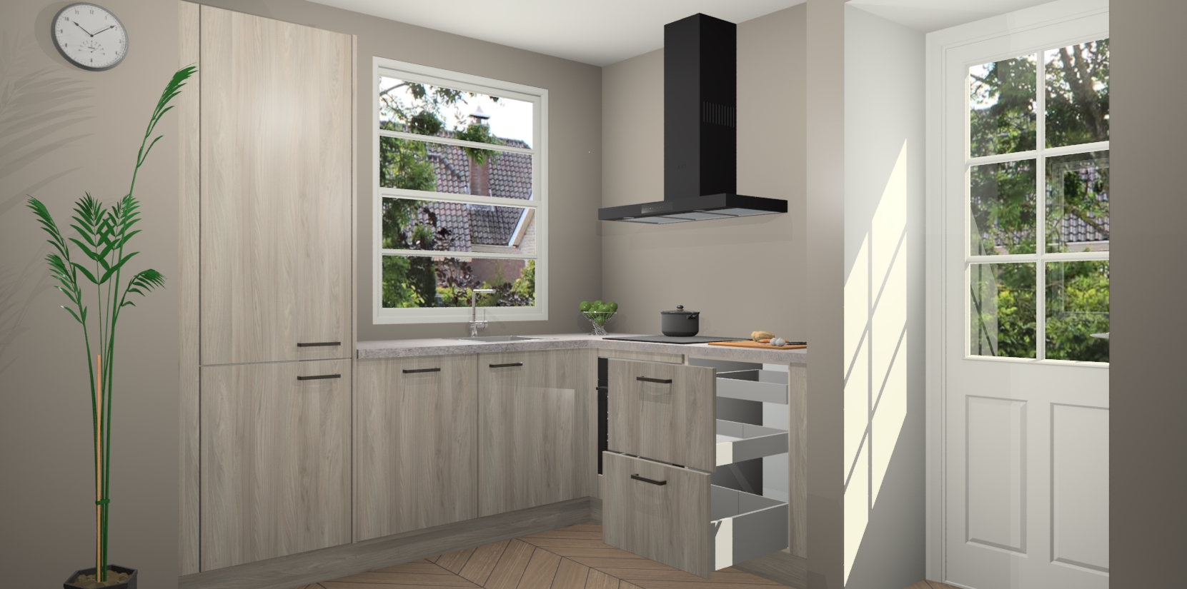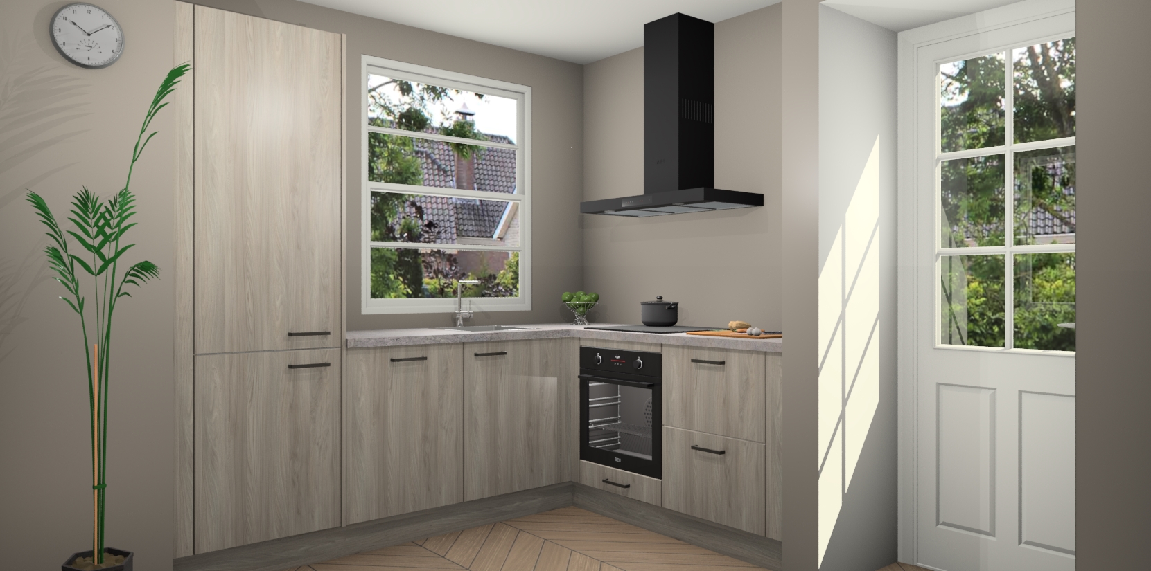 Wilt u een echte aanwinst voor uw keuken, maar bent u op zoek naar iets specialers dan de standaardkeukens? Kies dan voor de Olm keuken Harbin! Dit prachtige hoekkeukenontwerp geeft u alle ruimte om optimaal te genieten van heerlijk koken. Het uitmuntende afwerkingsniveau, de fraaie houtstructuur en de sfeervolle zwarte grepen maken van de Olm keuken Harbin de perfecte keuze voor zowel enthousiaste thuiskoks als design-minded interieurliefhebbers.