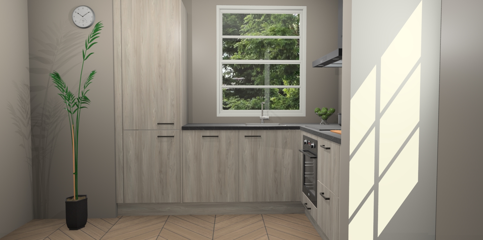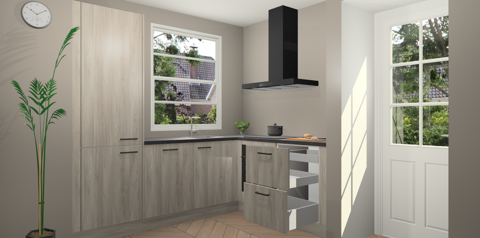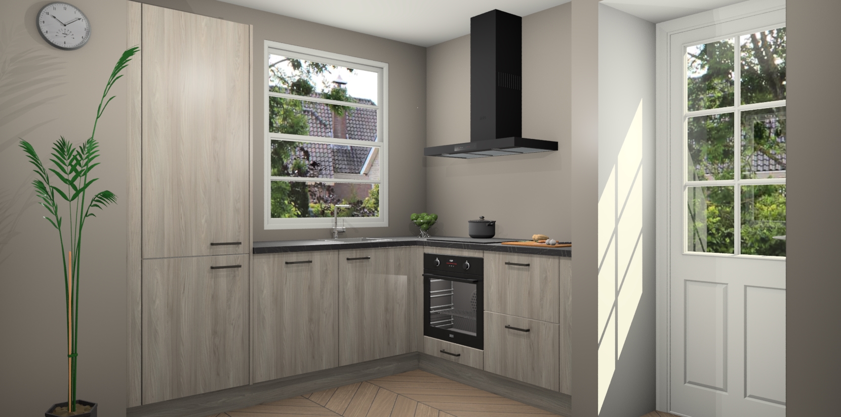 Wilt u een echte aanwinst voor uw keuken, maar bent u op zoek naar iets specialers dan de standaardkeukens? Kies dan voor de Olm keuken Harbin! Dit prachtige hoekkeukenontwerp geeft u alle ruimte om optimaal te genieten van heerlijk koken. Het uitmuntende afwerkingsniveau, de fraaie houtstructuur en de sfeervolle zwarte grepen maken van de Olm keuken Harbin de perfecte keuze voor zowel enthousiaste thuiskoks als design-minded interieurliefhebbers.