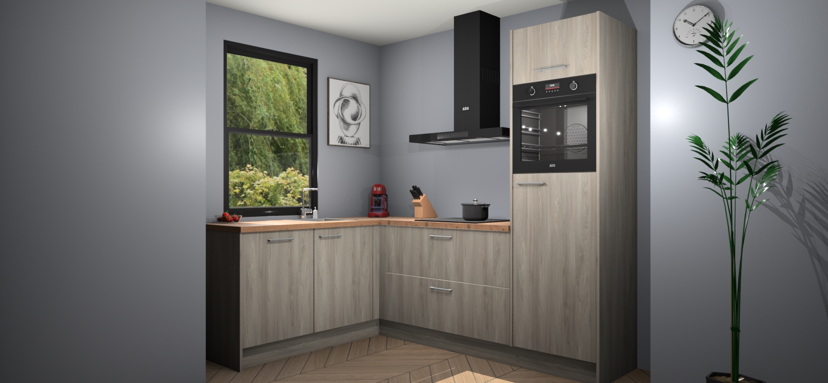 Deze prachtige hoekkeuken heeft alle benodigdheden om uw droomkook- en eetruimte compleet te maken. De Olm kasten bieden een echo van raffinement, terwijl de 5 inbouwapparaten genoeg opties bieden voor het bereiden van heerlijke maaltijden. De oven, inductiekookplaat, afzuigkap, vaatwasser en koelkast zorgen ervoor dat u tijd in de keuken zo efficiënt mogelijk verloopt, terwijl ze ook dat extra vleugje luxe bieden.