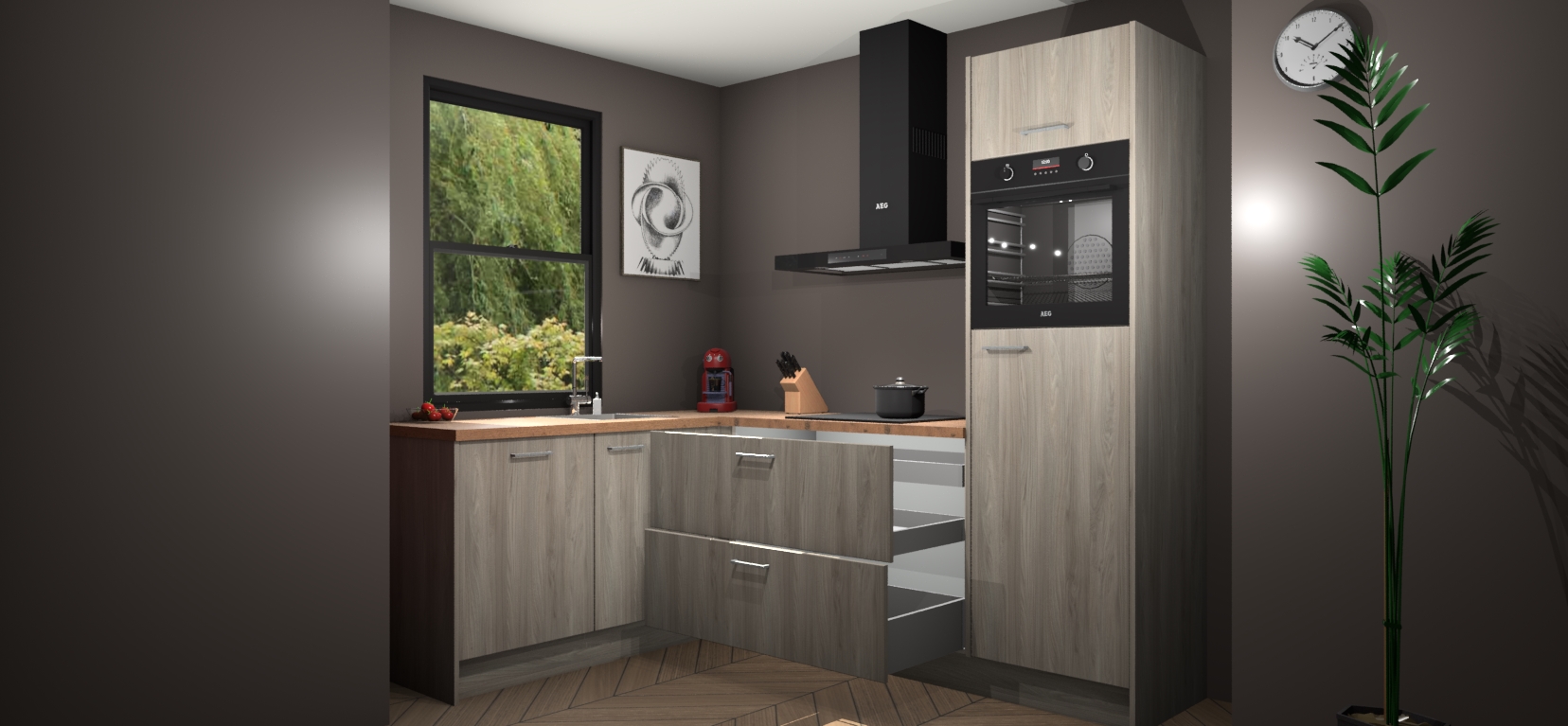 Deze prachtige hoekkeuken heeft alle benodigdheden om uw droomkook- en eetruimte compleet te maken. De Olm kasten bieden een echo van raffinement, terwijl de 5 inbouwapparaten genoeg opties bieden voor het bereiden van heerlijke maaltijden. De oven, inductiekookplaat, afzuigkap, vaatwasser en koelkast zorgen ervoor dat u tijd in de keuken zo efficiënt mogelijk verloopt, terwijl ze ook dat extra vleugje luxe bieden.