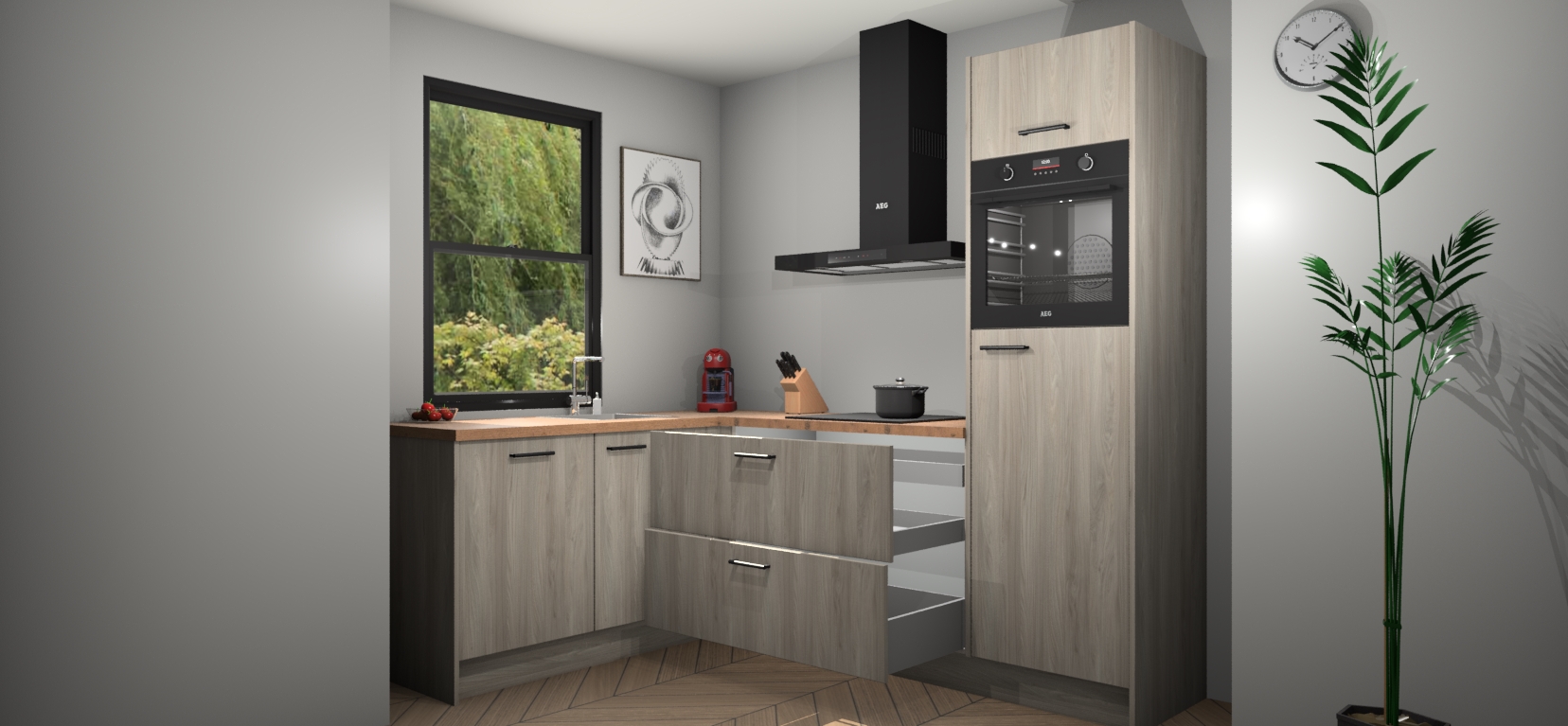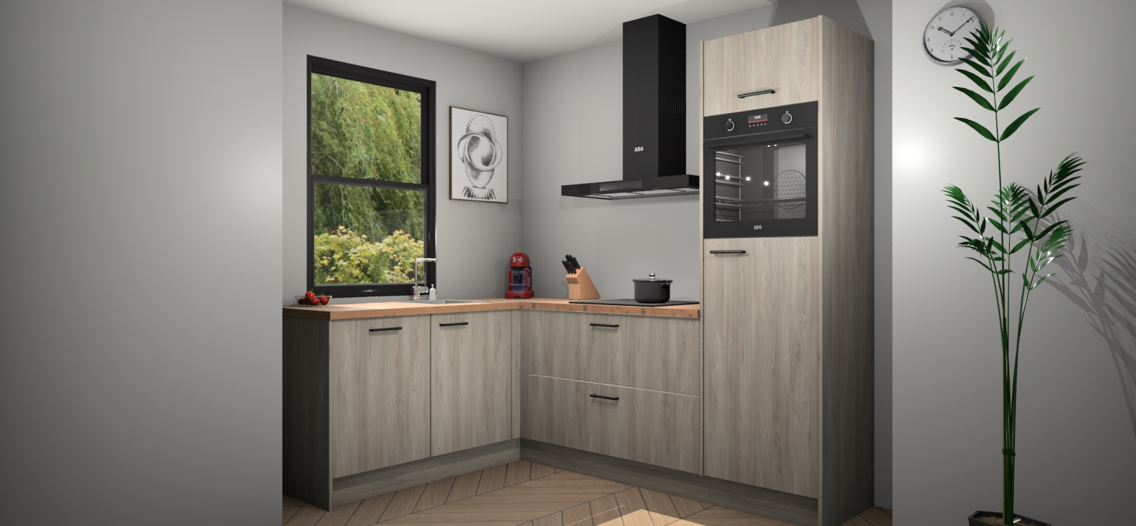Deze prachtige hoekkeuken heeft alle benodigdheden om uw droomkook- en eetruimte compleet te maken. De Olm kasten bieden een echo van raffinement, terwijl de 5 inbouwapparaten genoeg opties bieden voor het bereiden van heerlijke maaltijden. De oven, inductiekookplaat, afzuigkap, vaatwasser en koelkast zorgen ervoor dat u tijd in de keuken zo efficiënt mogelijk verloopt, terwijl ze ook dat extra vleugje luxe bieden.