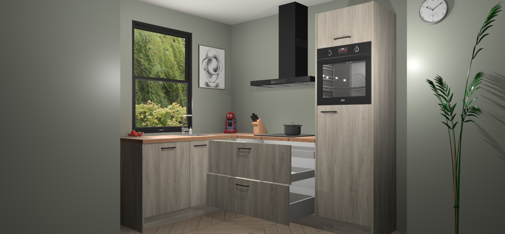Deze prachtige hoekkeuken heeft alle benodigdheden om uw droomkook- en eetruimte compleet te maken. De Olm kasten bieden een echo van raffinement, terwijl de 5 inbouwapparaten genoeg opties bieden voor het bereiden van heerlijke maaltijden. De oven, inductiekookplaat, afzuigkap, vaatwasser en koelkast zorgen ervoor dat u tijd in de keuken zo efficiënt mogelijk verloopt, terwijl ze ook dat extra vleugje luxe bieden.