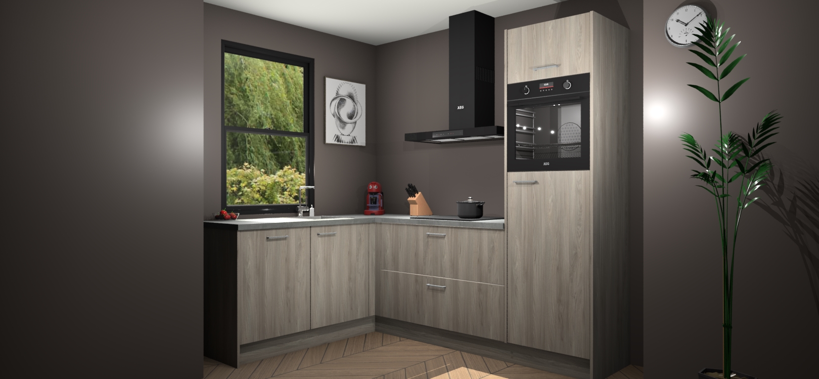 Deze prachtige hoekkeuken heeft alle benodigdheden om uw droomkook- en eetruimte compleet te maken. De Olm kasten bieden een echo van raffinement, terwijl de 5 inbouwapparaten genoeg opties bieden voor het bereiden van heerlijke maaltijden. De oven, inductiekookplaat, afzuigkap, vaatwasser en koelkast zorgen ervoor dat u tijd in de keuken zo efficiënt mogelijk verloopt, terwijl ze ook dat extra vleugje luxe bieden.