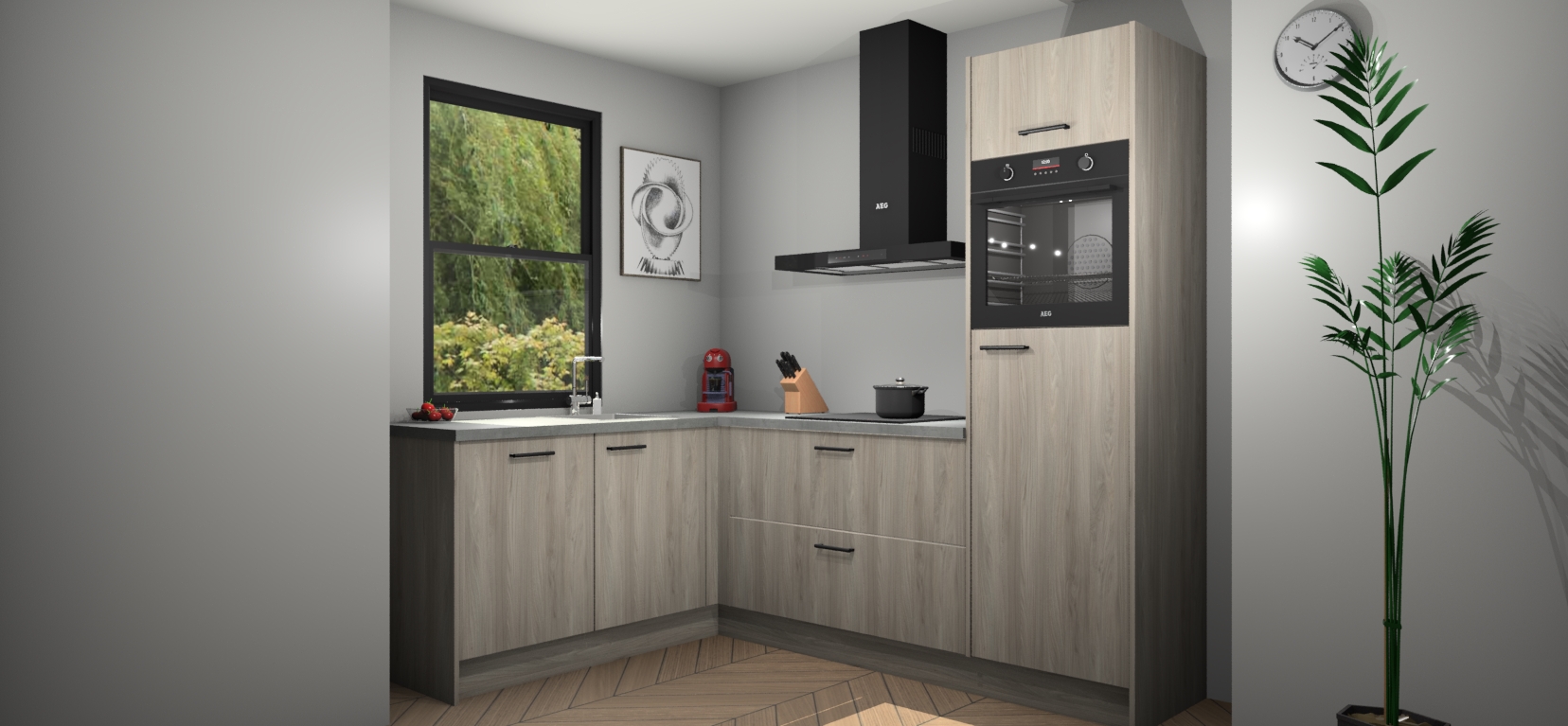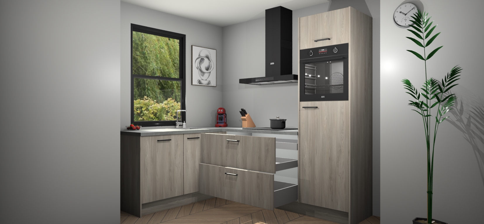 Deze prachtige hoekkeuken heeft alle benodigdheden om uw droomkook- en eetruimte compleet te maken. De Olm kasten bieden een echo van raffinement, terwijl de 5 inbouwapparaten genoeg opties bieden voor het bereiden van heerlijke maaltijden. De oven, inductiekookplaat, afzuigkap, vaatwasser en koelkast zorgen ervoor dat u tijd in de keuken zo efficiënt mogelijk verloopt, terwijl ze ook dat extra vleugje luxe bieden.