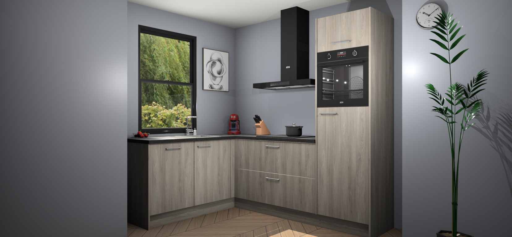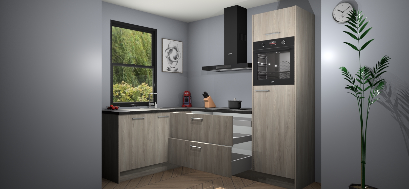 Deze prachtige hoekkeuken heeft alle benodigdheden om uw droomkook- en eetruimte compleet te maken. De Olm kasten bieden een echo van raffinement, terwijl de 5 inbouwapparaten genoeg opties bieden voor het bereiden van heerlijke maaltijden. De oven, inductiekookplaat, afzuigkap, vaatwasser en koelkast zorgen ervoor dat u tijd in de keuken zo efficiënt mogelijk verloopt, terwijl ze ook dat extra vleugje luxe bieden.