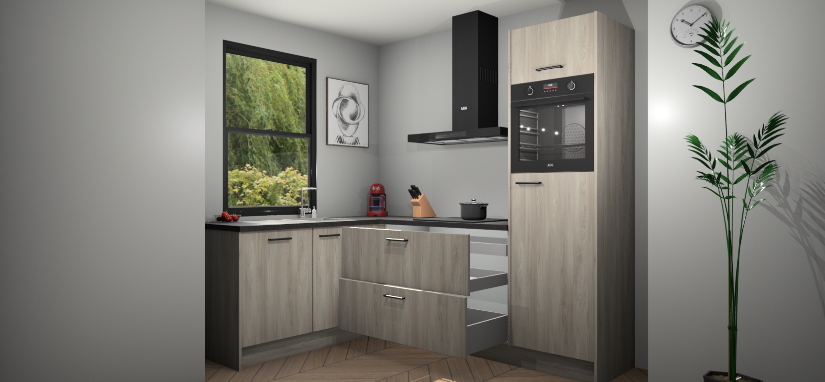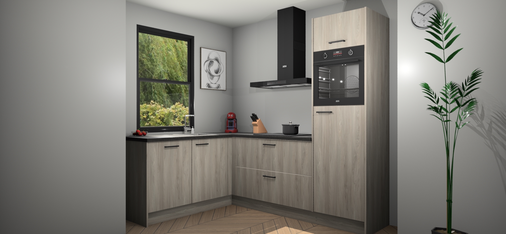 Deze prachtige hoekkeuken heeft alle benodigdheden om uw droomkook- en eetruimte compleet te maken. De Olm kasten bieden een echo van raffinement, terwijl de 5 inbouwapparaten genoeg opties bieden voor het bereiden van heerlijke maaltijden. De oven, inductiekookplaat, afzuigkap, vaatwasser en koelkast zorgen ervoor dat u tijd in de keuken zo efficiënt mogelijk verloopt, terwijl ze ook dat extra vleugje luxe bieden.
