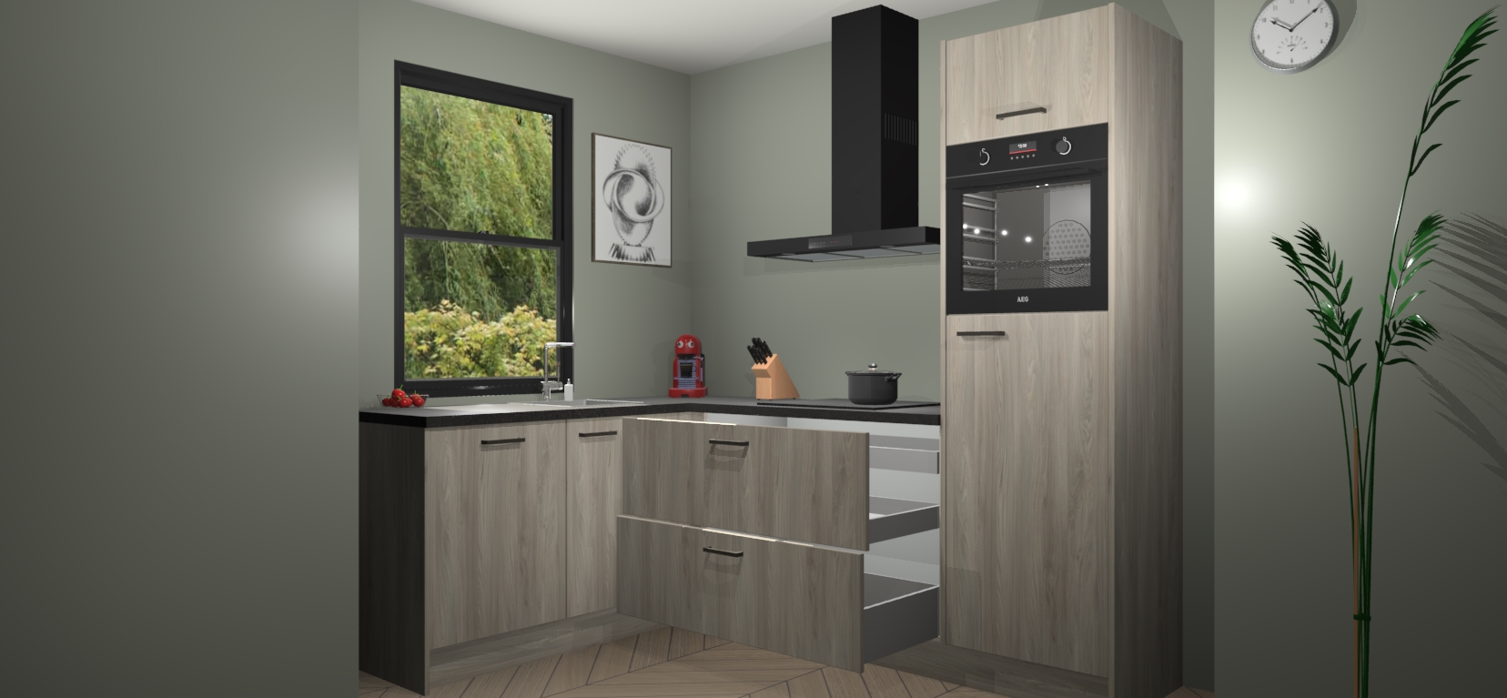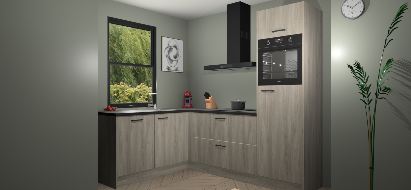 Deze prachtige hoekkeuken heeft alle benodigdheden om uw droomkook- en eetruimte compleet te maken. De Olm kasten bieden een echo van raffinement, terwijl de 5 inbouwapparaten genoeg opties bieden voor het bereiden van heerlijke maaltijden. De oven, inductiekookplaat, afzuigkap, vaatwasser en koelkast zorgen ervoor dat u tijd in de keuken zo efficiënt mogelijk verloopt, terwijl ze ook dat extra vleugje luxe bieden.