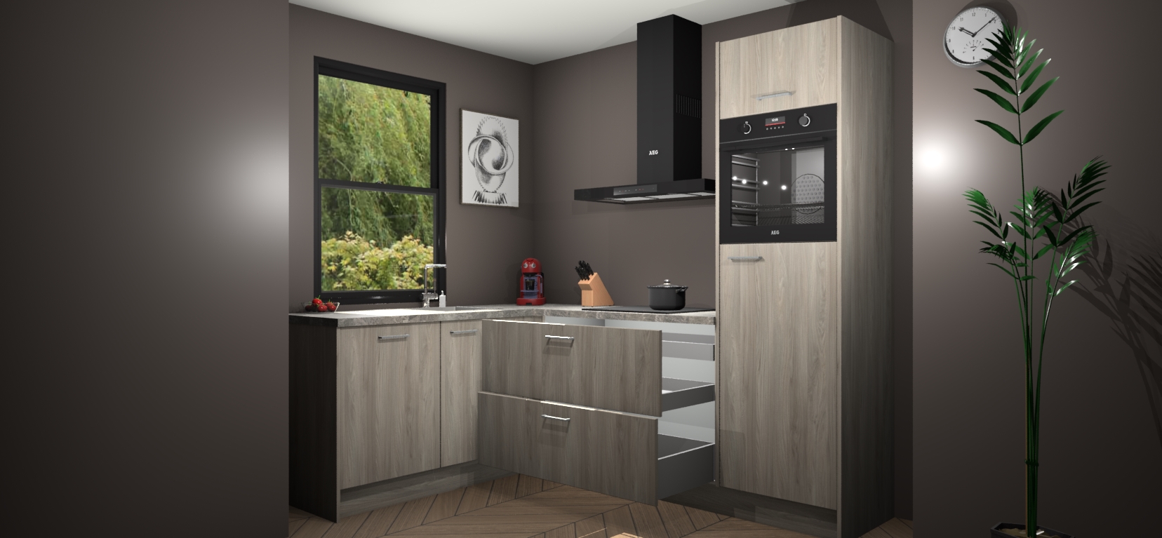Deze prachtige hoekkeuken heeft alle benodigdheden om uw droomkook- en eetruimte compleet te maken. De Olm kasten bieden een echo van raffinement, terwijl de 5 inbouwapparaten genoeg opties bieden voor het bereiden van heerlijke maaltijden. De oven, inductiekookplaat, afzuigkap, vaatwasser en koelkast zorgen ervoor dat u tijd in de keuken zo efficiënt mogelijk verloopt, terwijl ze ook dat extra vleugje luxe bieden.