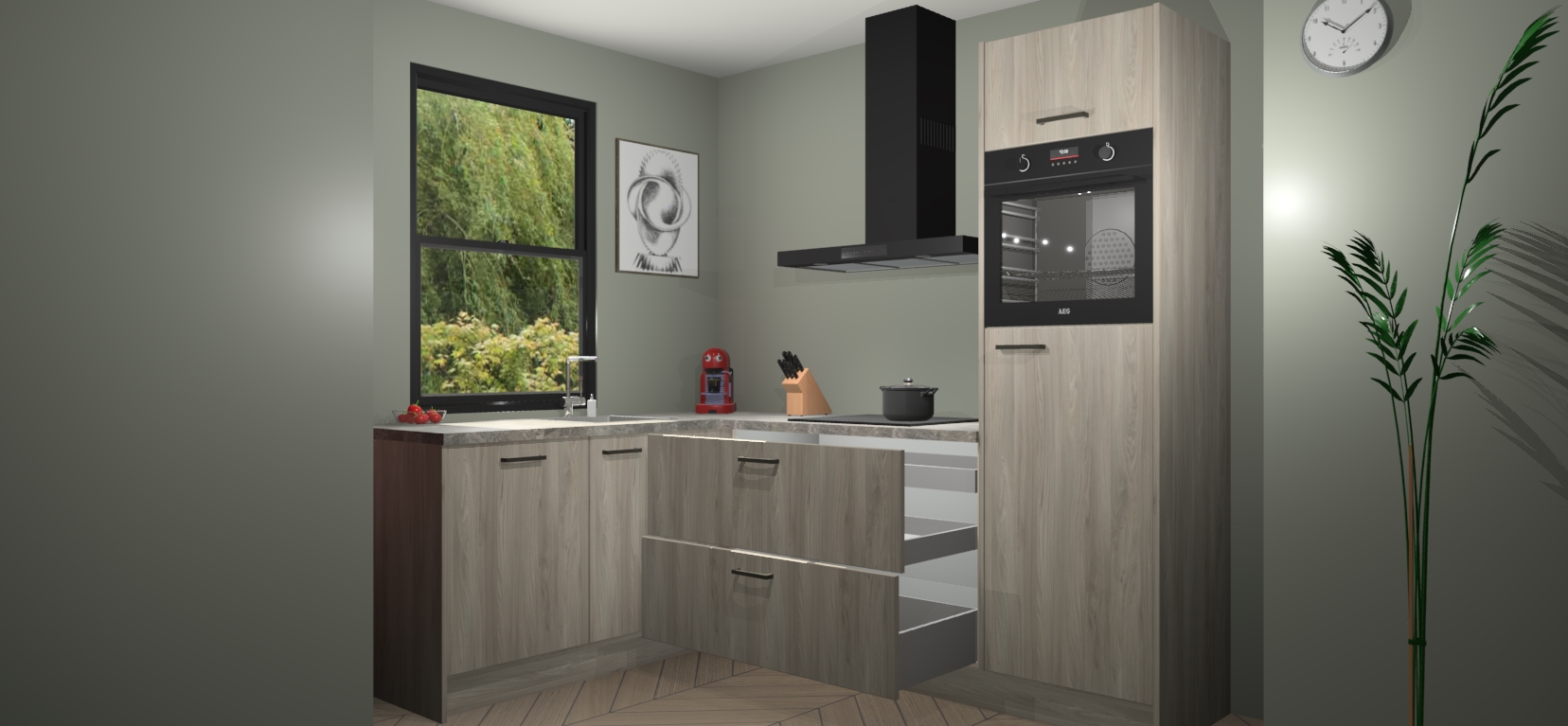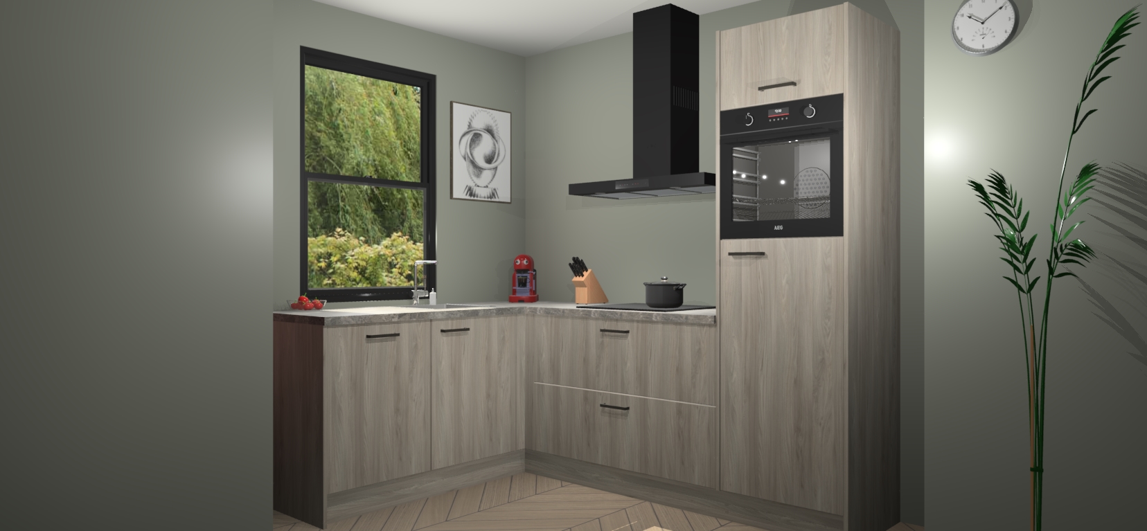 Deze prachtige hoekkeuken heeft alle benodigdheden om uw droomkook- en eetruimte compleet te maken. De Olm kasten bieden een echo van raffinement, terwijl de 5 inbouwapparaten genoeg opties bieden voor het bereiden van heerlijke maaltijden. De oven, inductiekookplaat, afzuigkap, vaatwasser en koelkast zorgen ervoor dat u tijd in de keuken zo efficiënt mogelijk verloopt, terwijl ze ook dat extra vleugje luxe bieden.