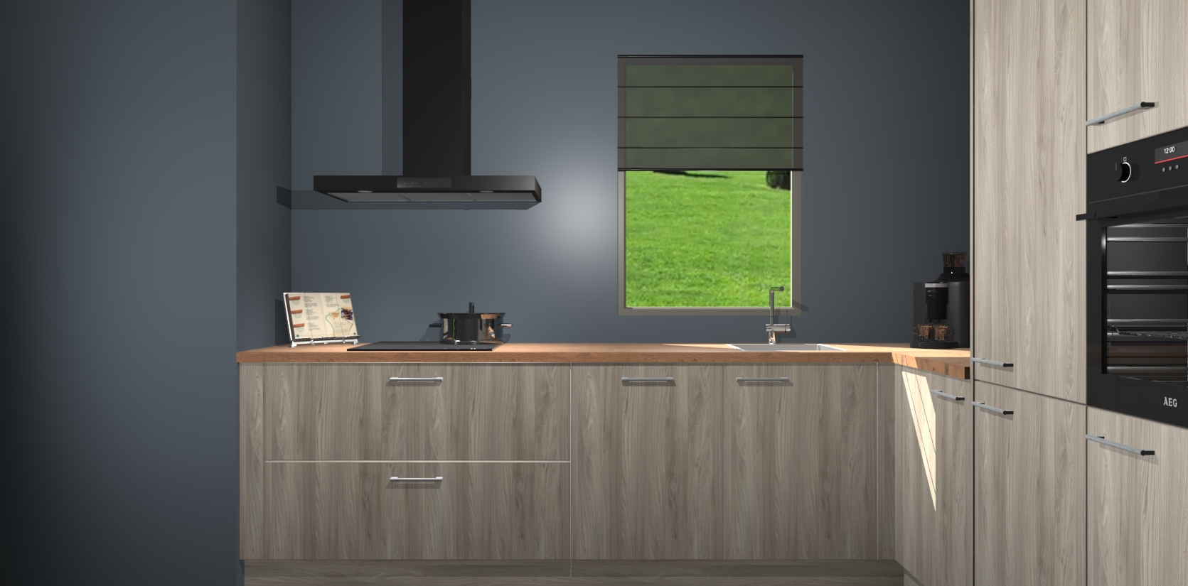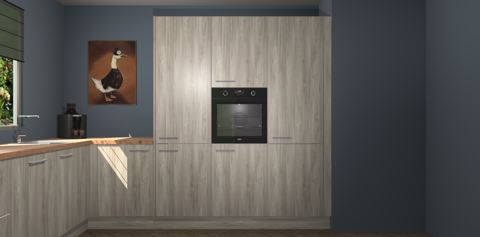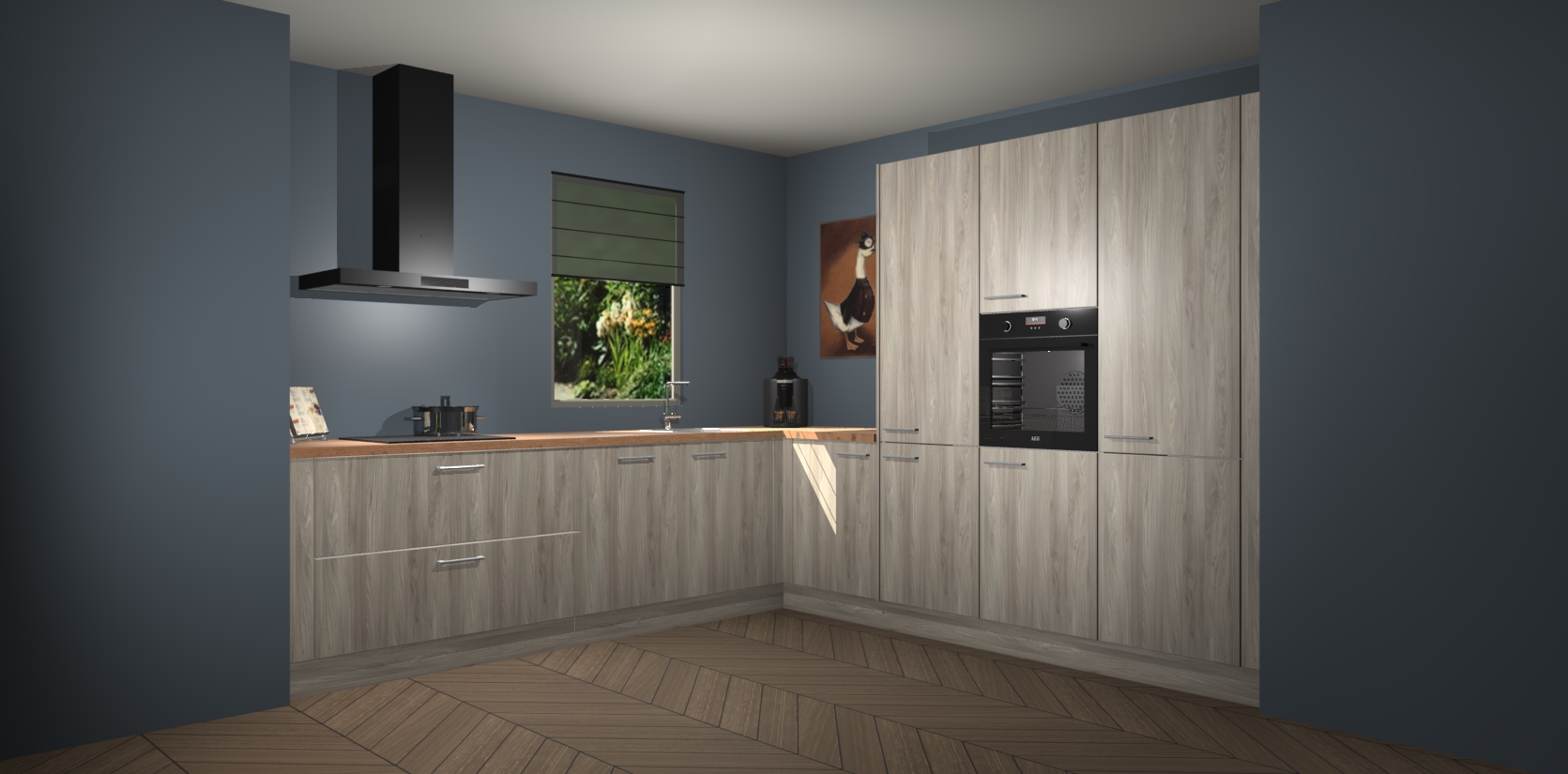 Welkom bij de Olm keuken Laos. Deze prachtige keuken zal de komende jaren het middelpunt van de belangstelling in uw huis zijn. Uitgerust met vijf inbouwapparaten komt u nooit kookgereedschap tekort. Bovendien geeft de warme houtlook elke ruimte een uitnodigende en tijdloze uitstraling.