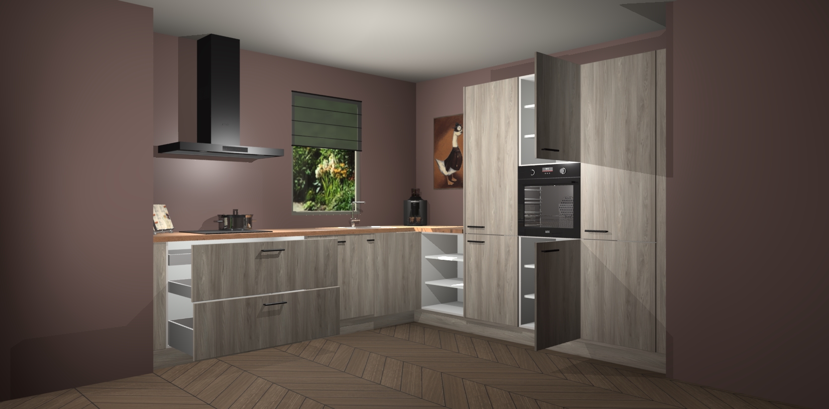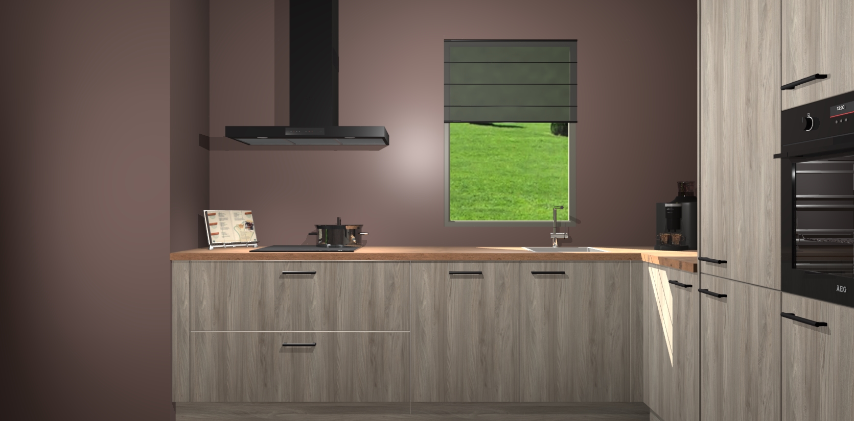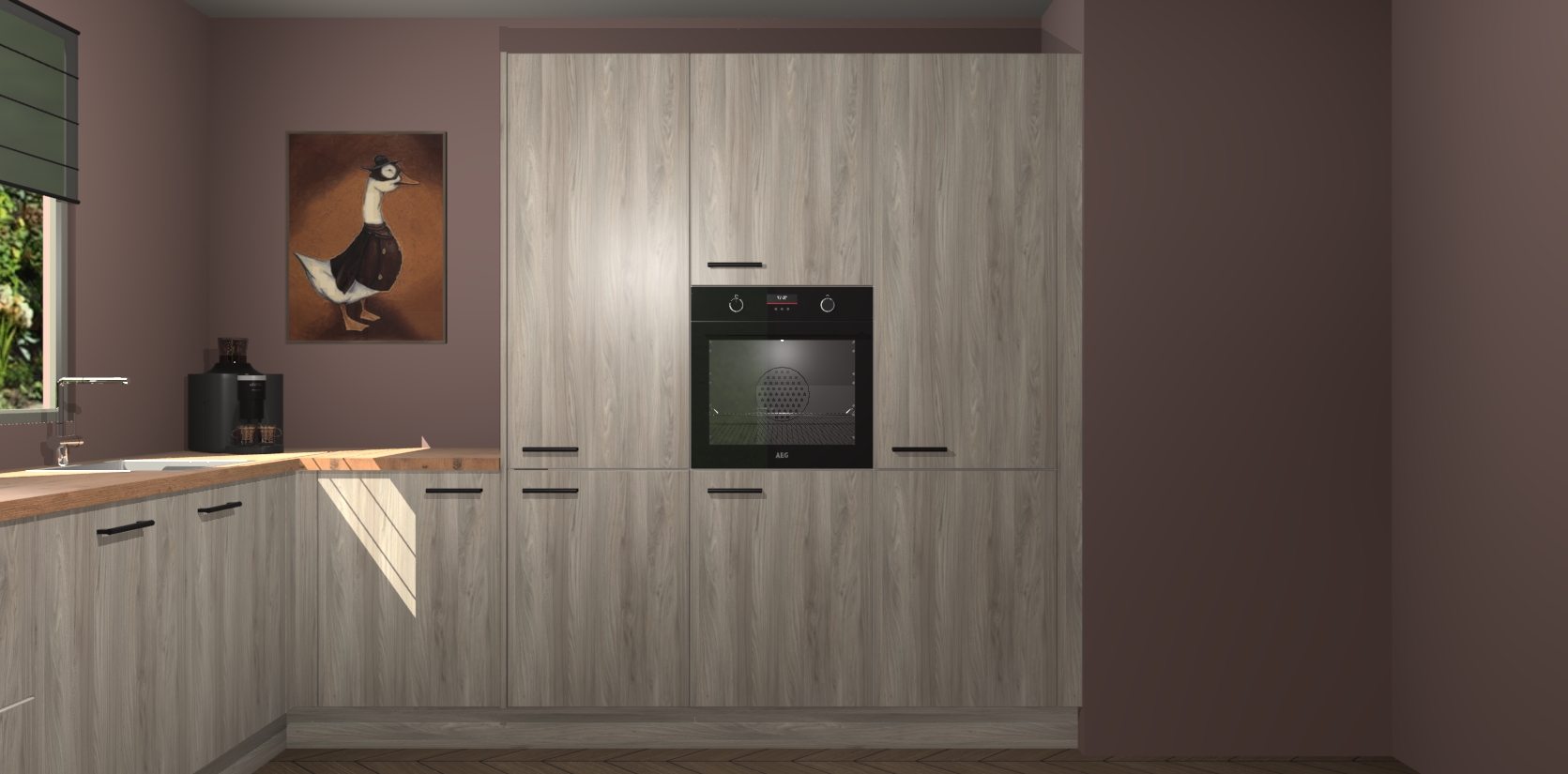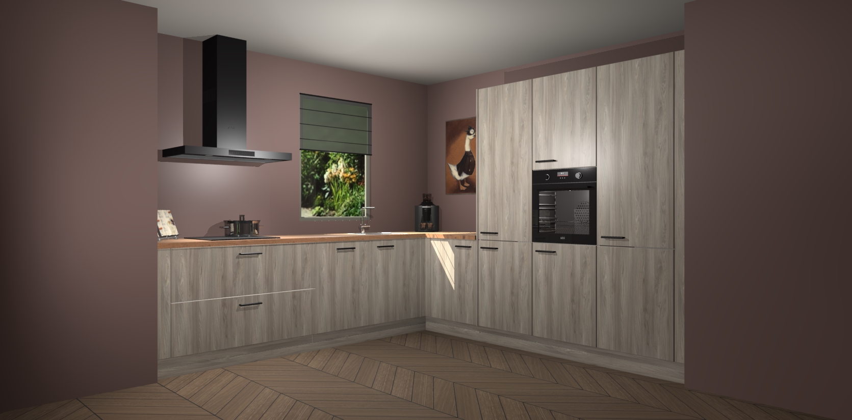 Welkom bij de Olm keuken Laos. Deze prachtige keuken zal de komende jaren het middelpunt van de belangstelling in uw huis zijn. Uitgerust met vijf inbouwapparaten komt u nooit kookgereedschap tekort. Bovendien geeft de warme houtlook elke ruimte een uitnodigende en tijdloze uitstraling.