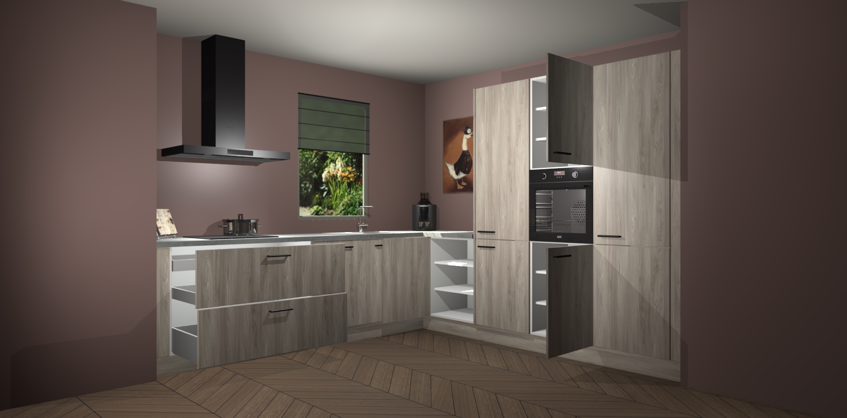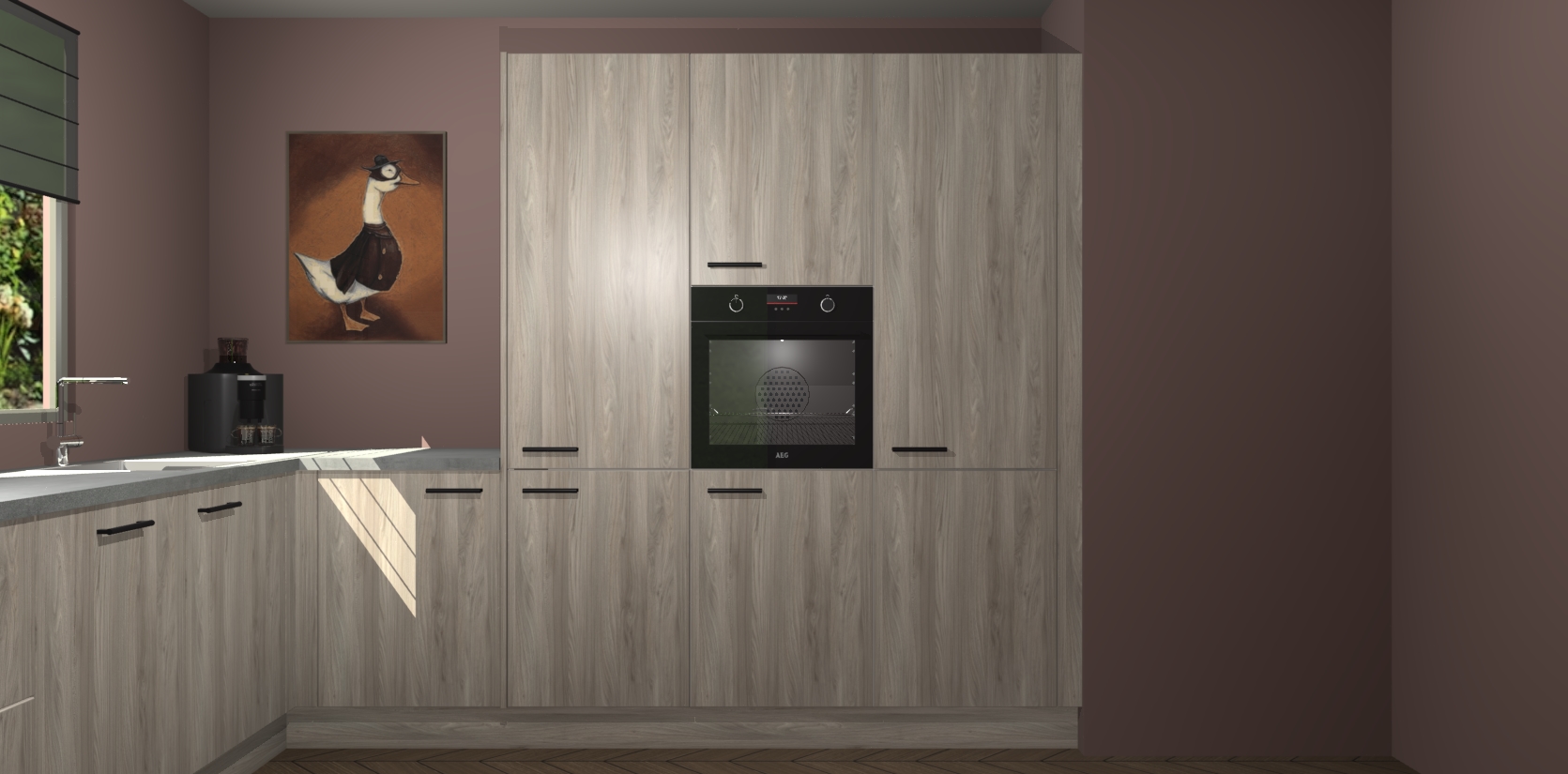 Welkom bij de Olm keuken Laos. Deze prachtige keuken zal de komende jaren het middelpunt van de belangstelling in uw huis zijn. Uitgerust met vijf inbouwapparaten komt u nooit kookgereedschap tekort. Bovendien geeft de warme houtlook elke ruimte een uitnodigende en tijdloze uitstraling.