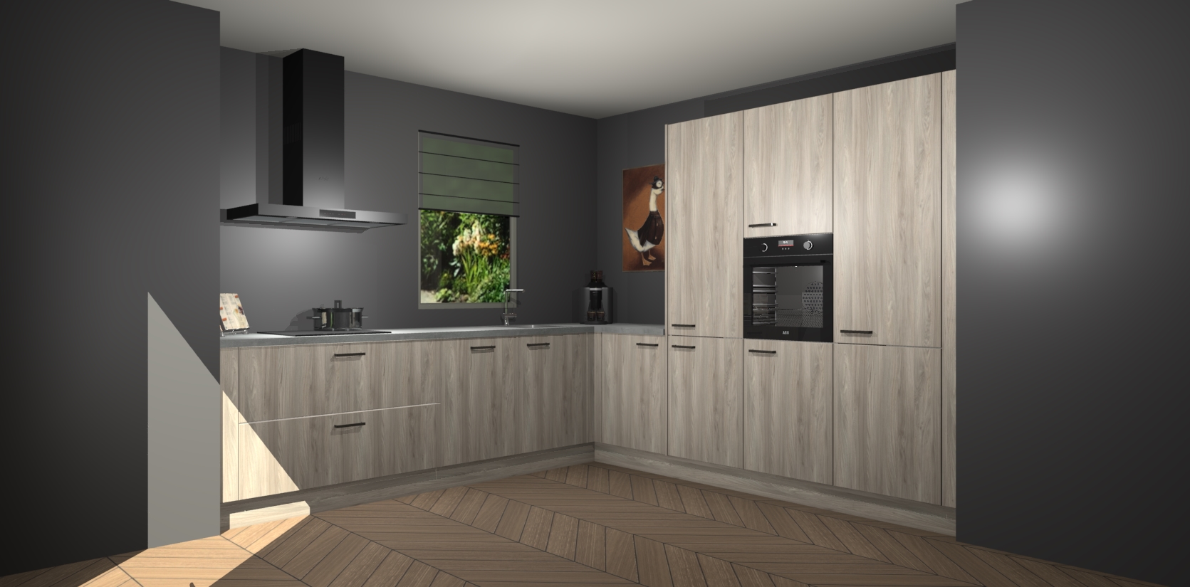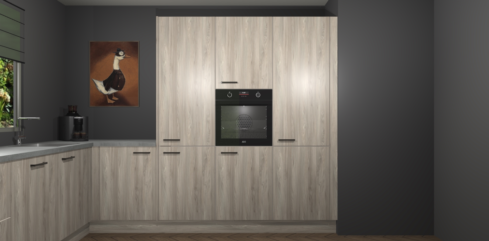 Welkom bij de Olm keuken Laos. Deze prachtige keuken zal de komende jaren het middelpunt van de belangstelling in uw huis zijn. Uitgerust met vijf inbouwapparaten komt u nooit kookgereedschap tekort. Bovendien geeft de warme houtlook elke ruimte een uitnodigende en tijdloze uitstraling.