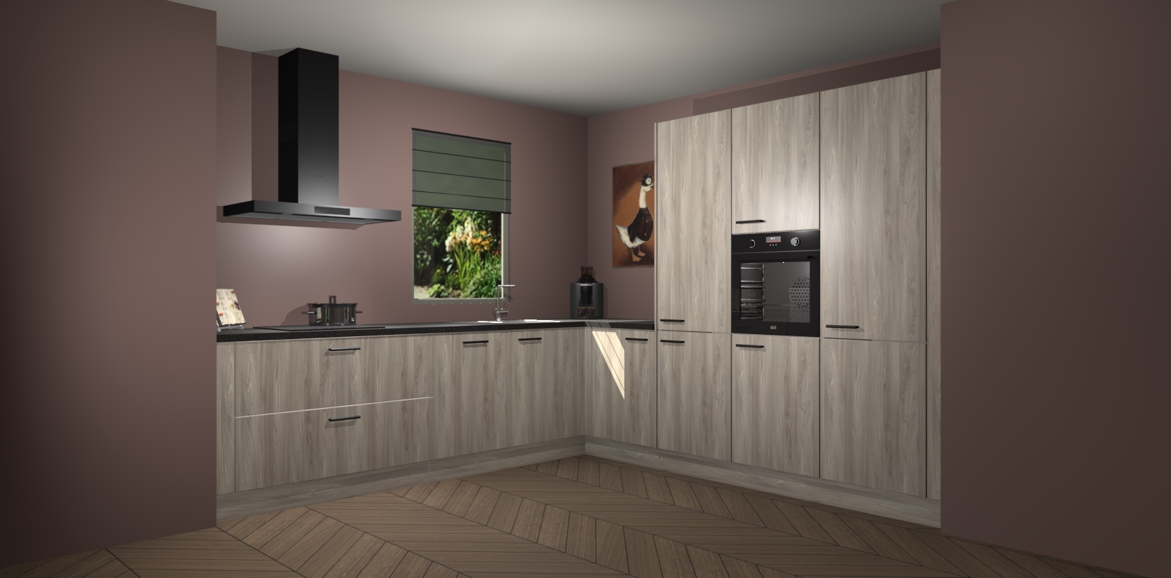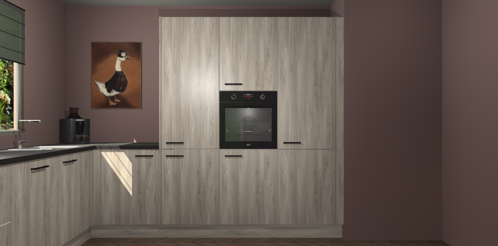 Welkom bij de Olm keuken Laos. Deze prachtige keuken zal de komende jaren het middelpunt van de belangstelling in uw huis zijn. Uitgerust met vijf inbouwapparaten komt u nooit kookgereedschap tekort. Bovendien geeft de warme houtlook elke ruimte een uitnodigende en tijdloze uitstraling.