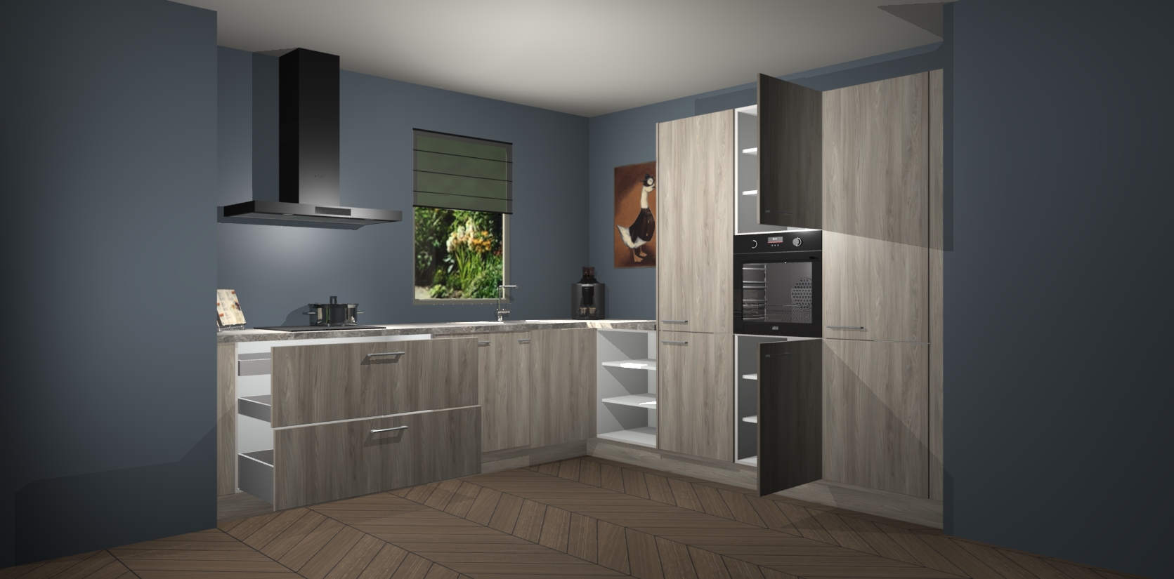 Welkom bij de Olm keuken Laos. Deze prachtige keuken zal de komende jaren het middelpunt van de belangstelling in uw huis zijn. Uitgerust met vijf inbouwapparaten komt u nooit kookgereedschap tekort. Bovendien geeft de warme houtlook elke ruimte een uitnodigende en tijdloze uitstraling.