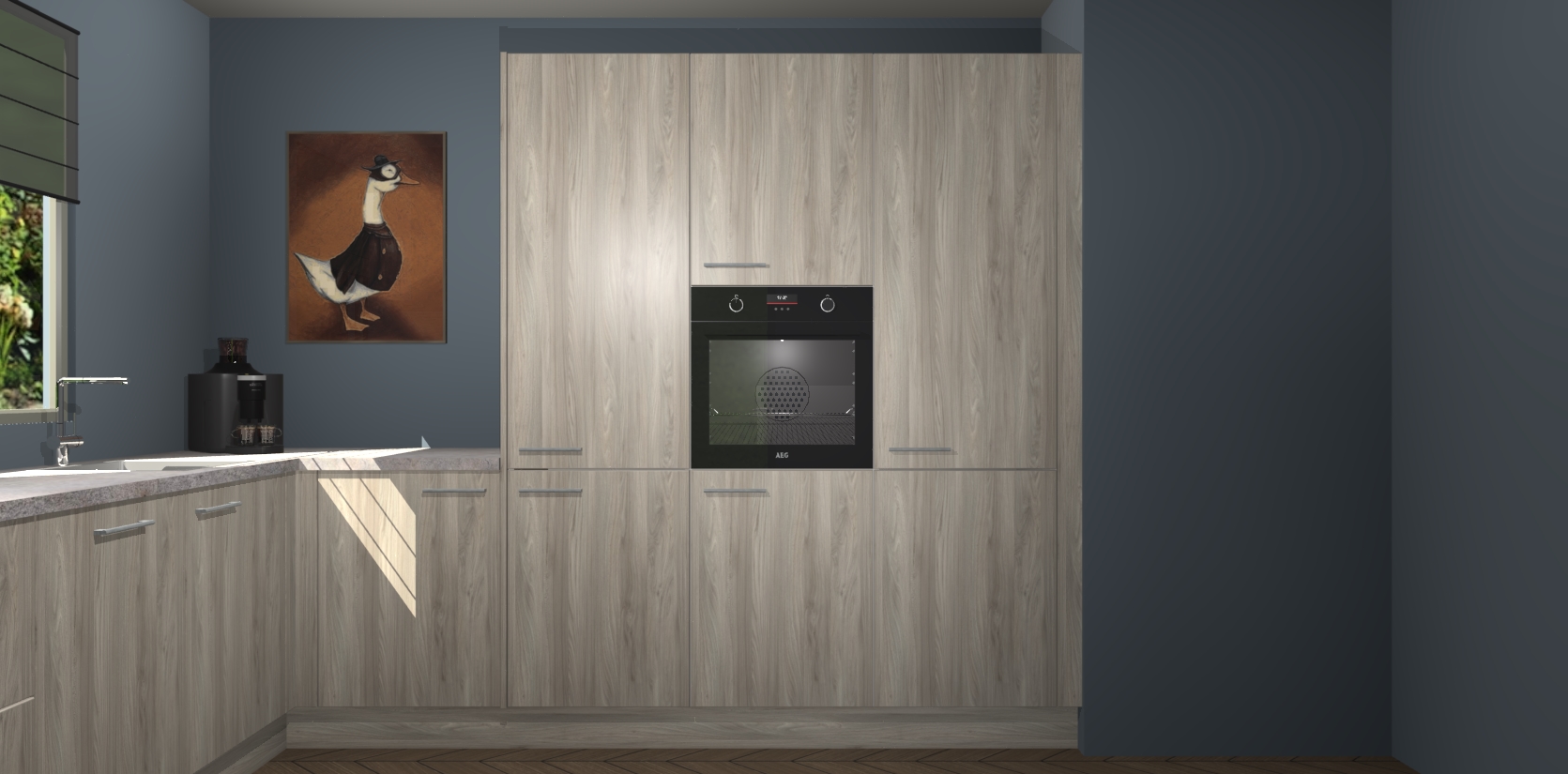 Welkom bij de Olm keuken Laos. Deze prachtige keuken zal de komende jaren het middelpunt van de belangstelling in uw huis zijn. Uitgerust met vijf inbouwapparaten komt u nooit kookgereedschap tekort. Bovendien geeft de warme houtlook elke ruimte een uitnodigende en tijdloze uitstraling.