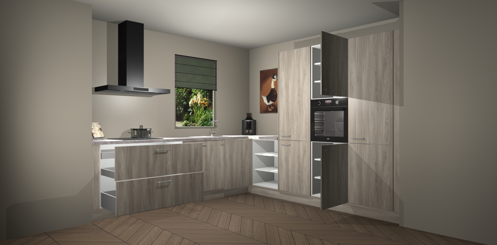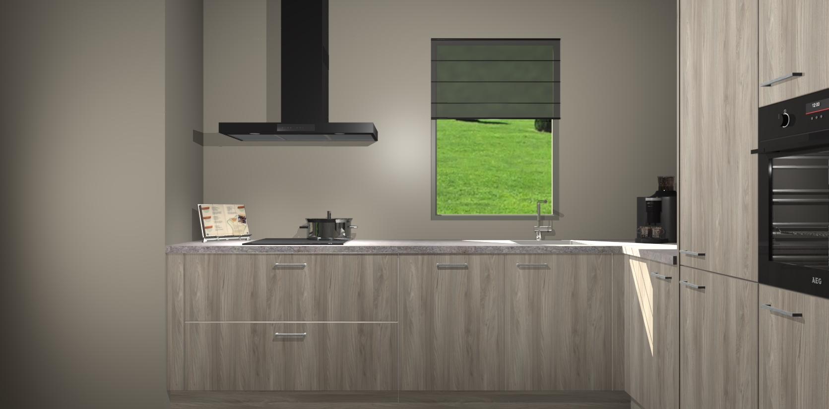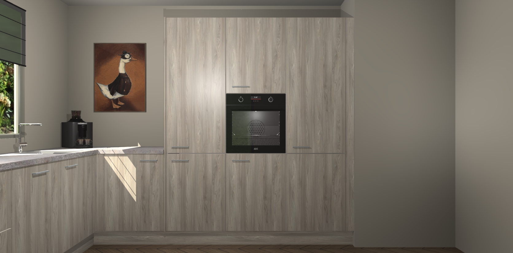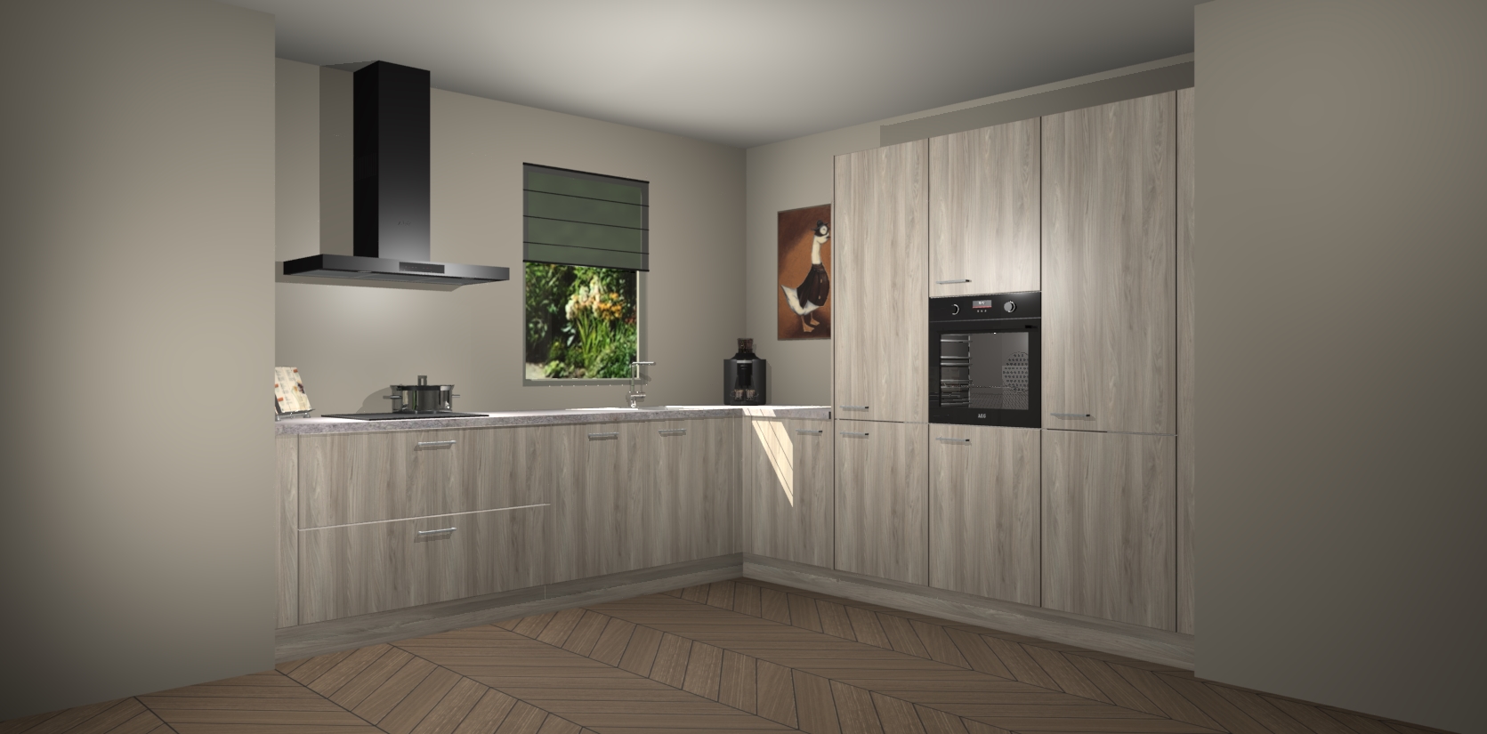 Welkom bij de Olm keuken Laos. Deze prachtige keuken zal de komende jaren het middelpunt van de belangstelling in uw huis zijn. Uitgerust met vijf inbouwapparaten komt u nooit kookgereedschap tekort. Bovendien geeft de warme houtlook elke ruimte een uitnodigende en tijdloze uitstraling.