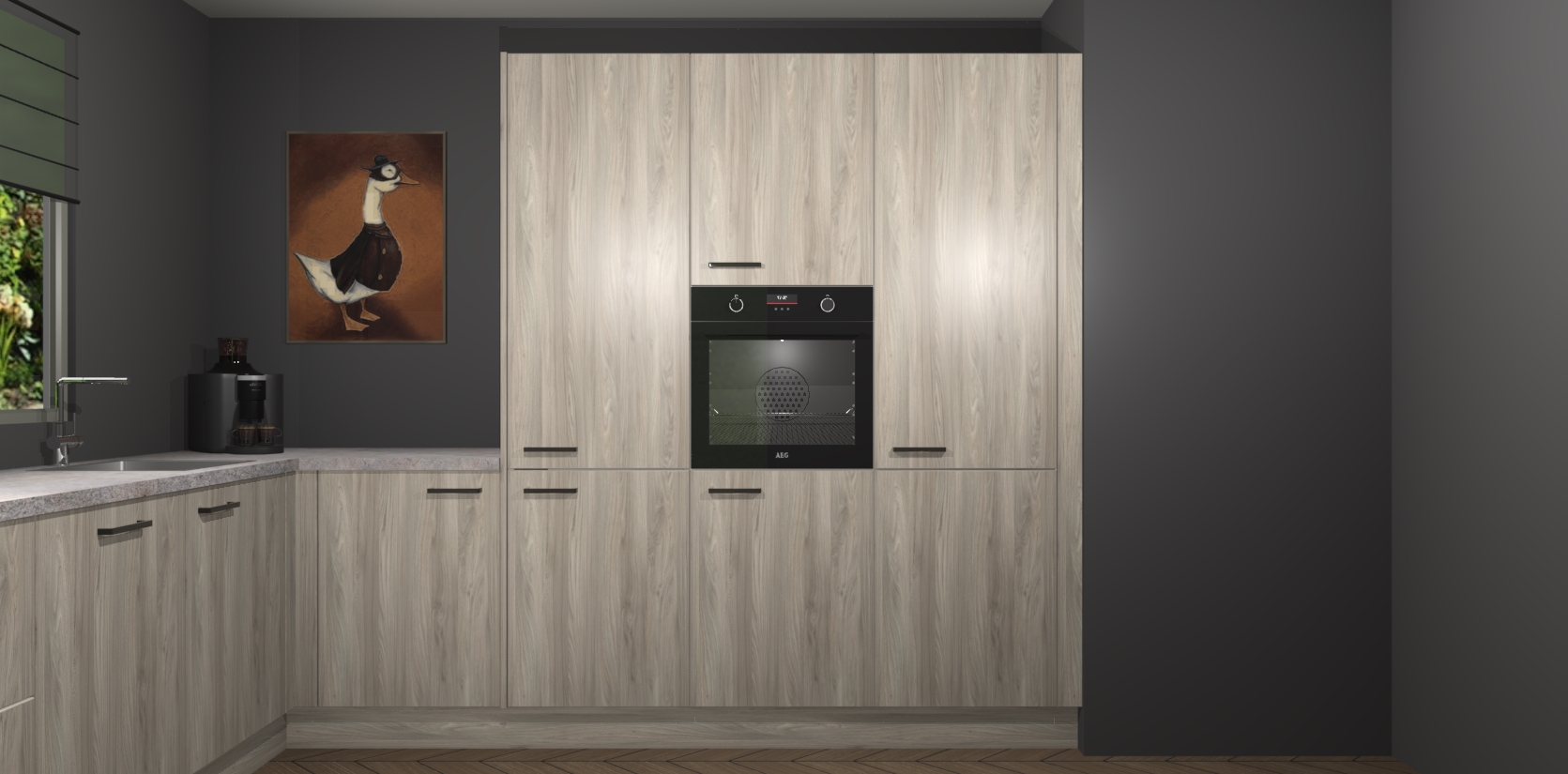 Welkom bij de Olm keuken Laos. Deze prachtige keuken zal de komende jaren het middelpunt van de belangstelling in uw huis zijn. Uitgerust met vijf inbouwapparaten komt u nooit kookgereedschap tekort. Bovendien geeft de warme houtlook elke ruimte een uitnodigende en tijdloze uitstraling.