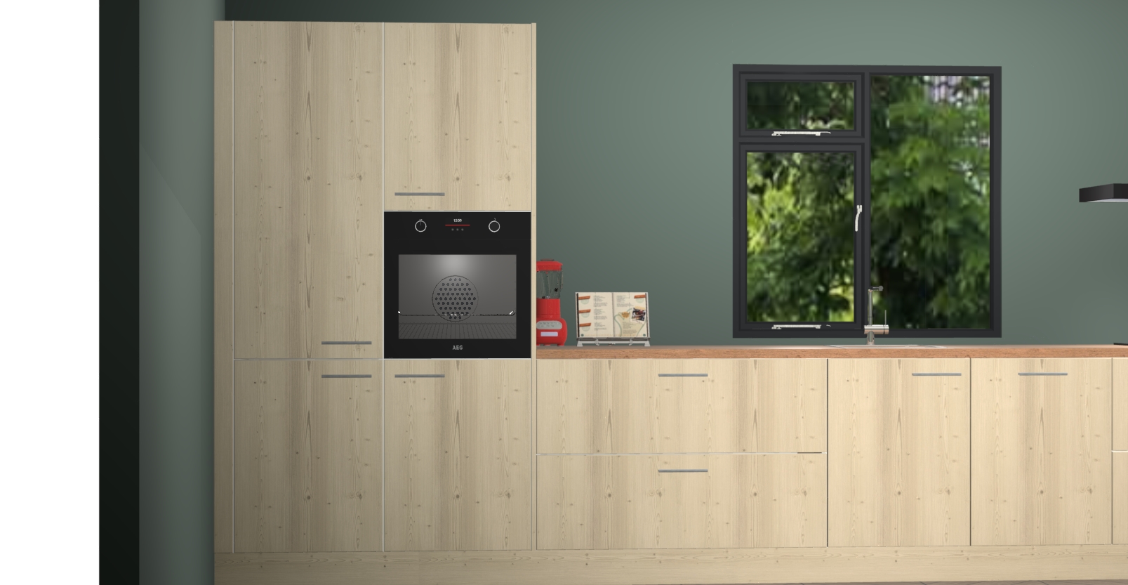 De Olm keuken Lille wordt geleverd met vijf inbouwapparaten - een oven, inductiekookplaat, afzuigkap, vaatwasser en koelkast. Maar dat is nog niet alles! Na bestelling kunnen deze apparaten eenvoudig worden geüpgraded naar premium AEG-apparatuur. Bovendien is er zelfs de optie om de oven te vervangen door een combimagnetron of uw inductiekookplaat te vervangen door een kookplaat met geïntegreerde afzuiging.
