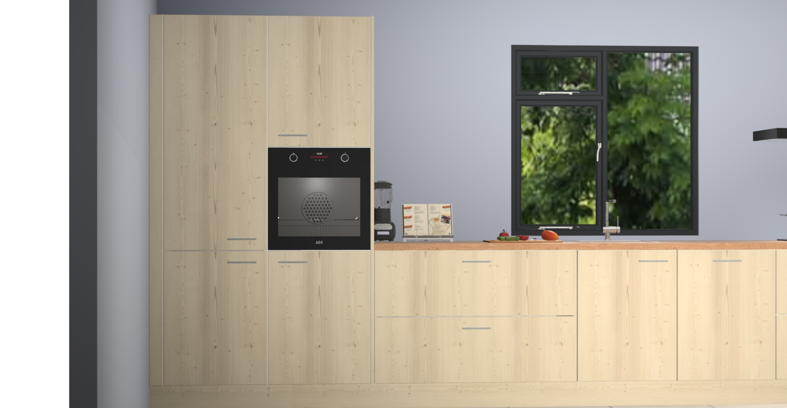 De Olm keuken Lille wordt geleverd met vijf inbouwapparaten - een oven, inductiekookplaat, afzuigkap, vaatwasser en koelkast. Maar dat is nog niet alles! Na bestelling kunnen deze apparaten eenvoudig worden geüpgraded naar premium AEG-apparatuur. Bovendien is er zelfs de optie om de oven te vervangen door een combimagnetron of uw inductiekookplaat te vervangen door een kookplaat met geïntegreerde afzuiging.