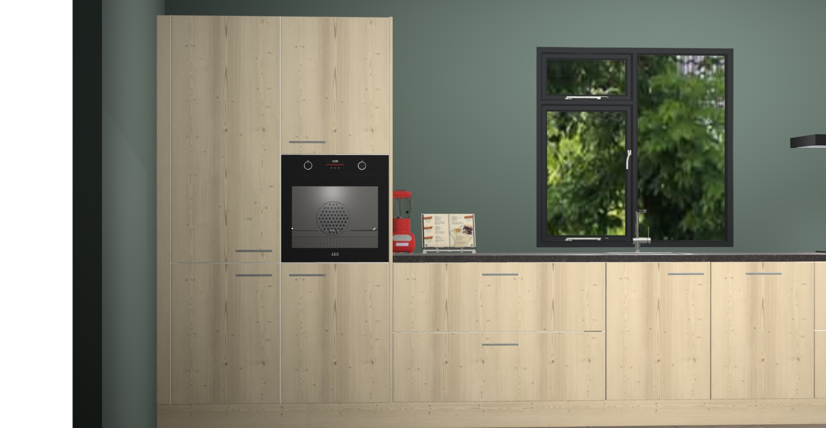 De Olm keuken Lille wordt geleverd met vijf inbouwapparaten - een oven, inductiekookplaat, afzuigkap, vaatwasser en koelkast. Maar dat is nog niet alles! Na bestelling kunnen deze apparaten eenvoudig worden geüpgraded naar premium AEG-apparatuur. Bovendien is er zelfs de optie om de oven te vervangen door een combimagnetron of uw inductiekookplaat te vervangen door een kookplaat met geïntegreerde afzuiging.