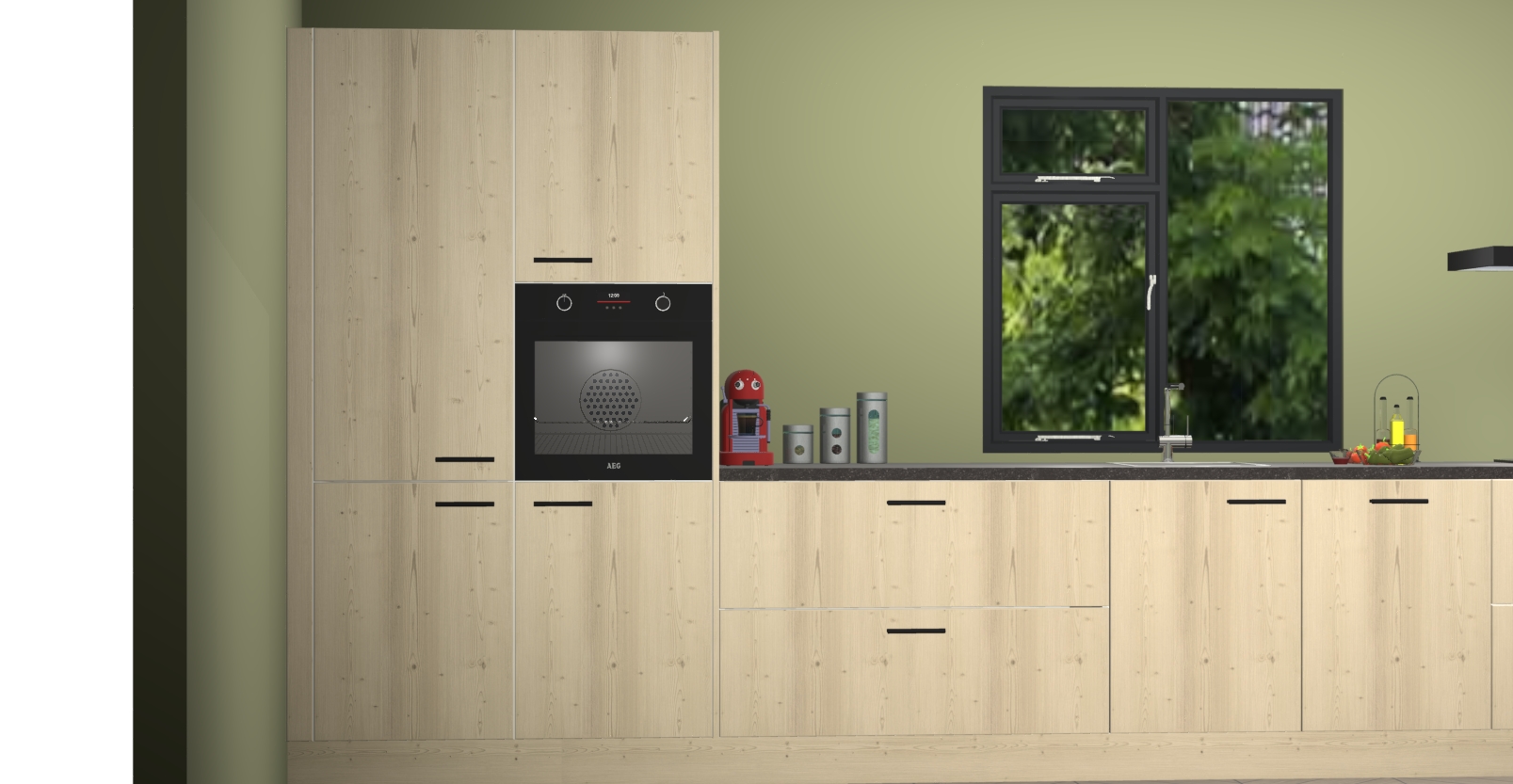 De Olm keuken Lille wordt geleverd met vijf inbouwapparaten - een oven, inductiekookplaat, afzuigkap, vaatwasser en koelkast. Maar dat is nog niet alles! Na bestelling kunnen deze apparaten eenvoudig worden geüpgraded naar premium AEG-apparatuur. Bovendien is er zelfs de optie om de oven te vervangen door een combimagnetron of uw inductiekookplaat te vervangen door een kookplaat met geïntegreerde afzuiging.