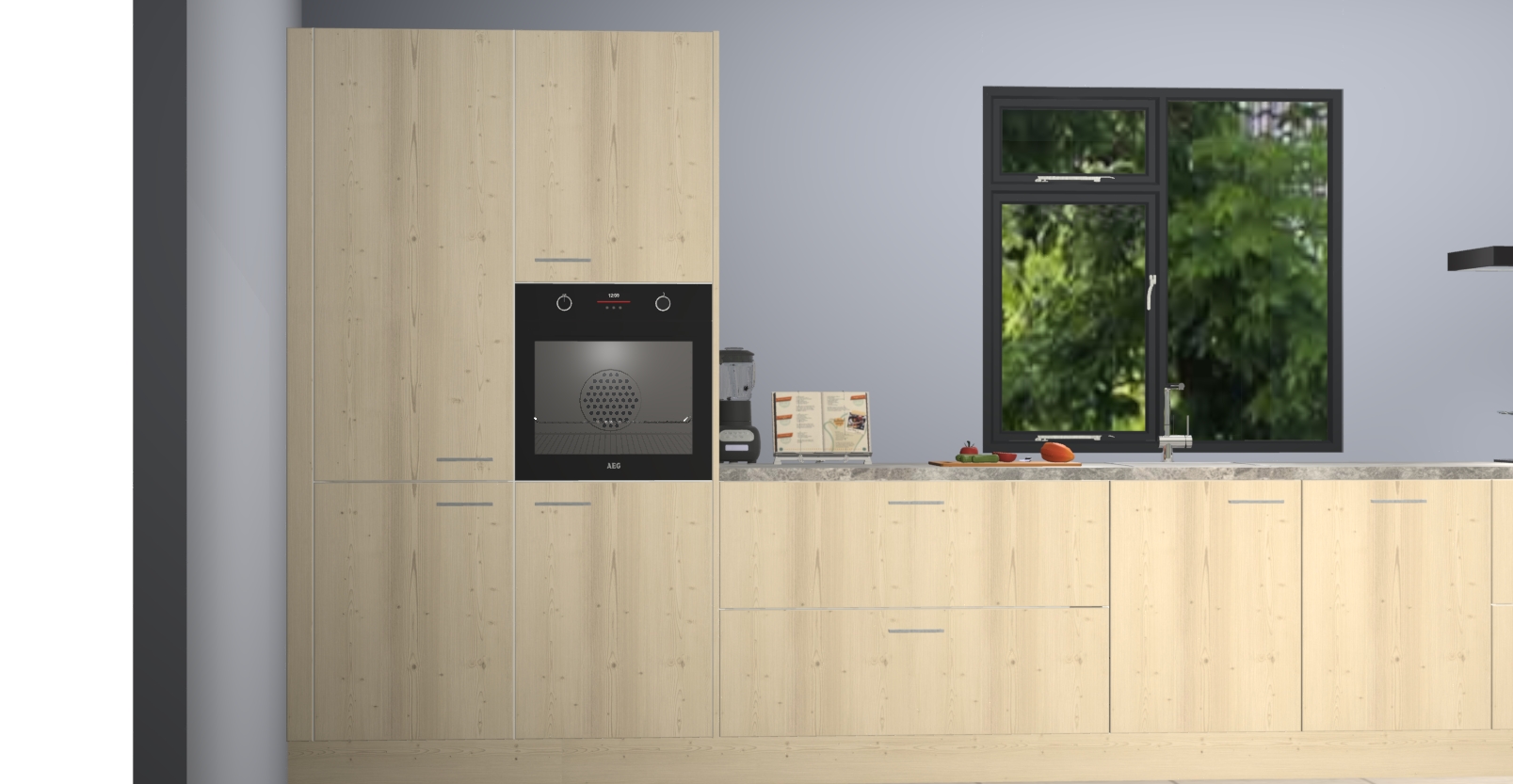 De Olm keuken Lille wordt geleverd met vijf inbouwapparaten - een oven, inductiekookplaat, afzuigkap, vaatwasser en koelkast. Maar dat is nog niet alles! Na bestelling kunnen deze apparaten eenvoudig worden geüpgraded naar premium AEG-apparatuur. Bovendien is er zelfs de optie om de oven te vervangen door een combimagnetron of uw inductiekookplaat te vervangen door een kookplaat met geïntegreerde afzuiging.