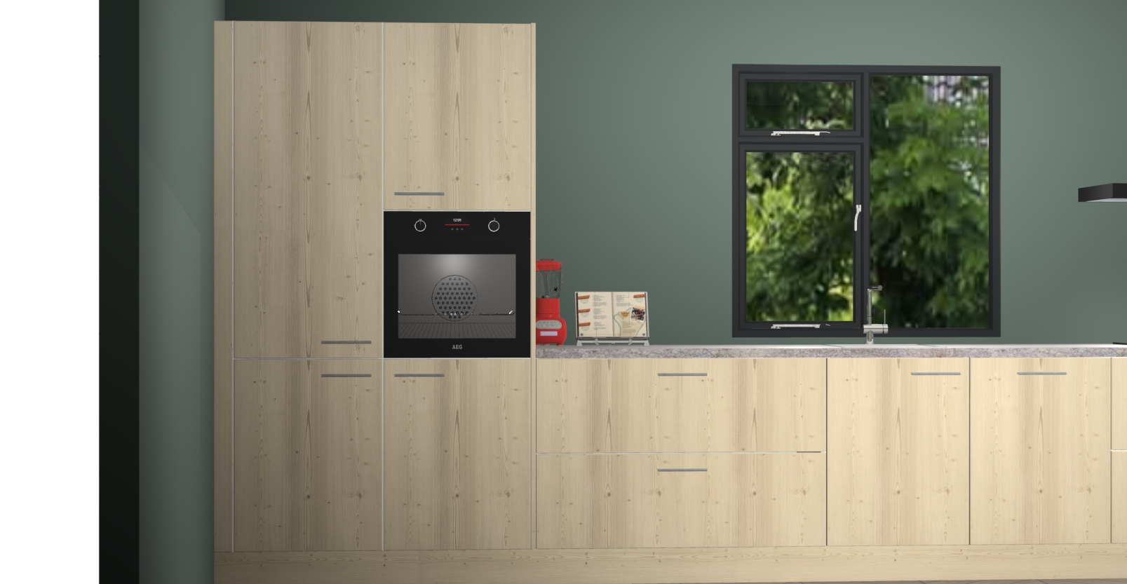 De Olm keuken Lille wordt geleverd met vijf inbouwapparaten - een oven, inductiekookplaat, afzuigkap, vaatwasser en koelkast. Maar dat is nog niet alles! Na bestelling kunnen deze apparaten eenvoudig worden geüpgraded naar premium AEG-apparatuur. Bovendien is er zelfs de optie om de oven te vervangen door een combimagnetron of uw inductiekookplaat te vervangen door een kookplaat met geïntegreerde afzuiging.