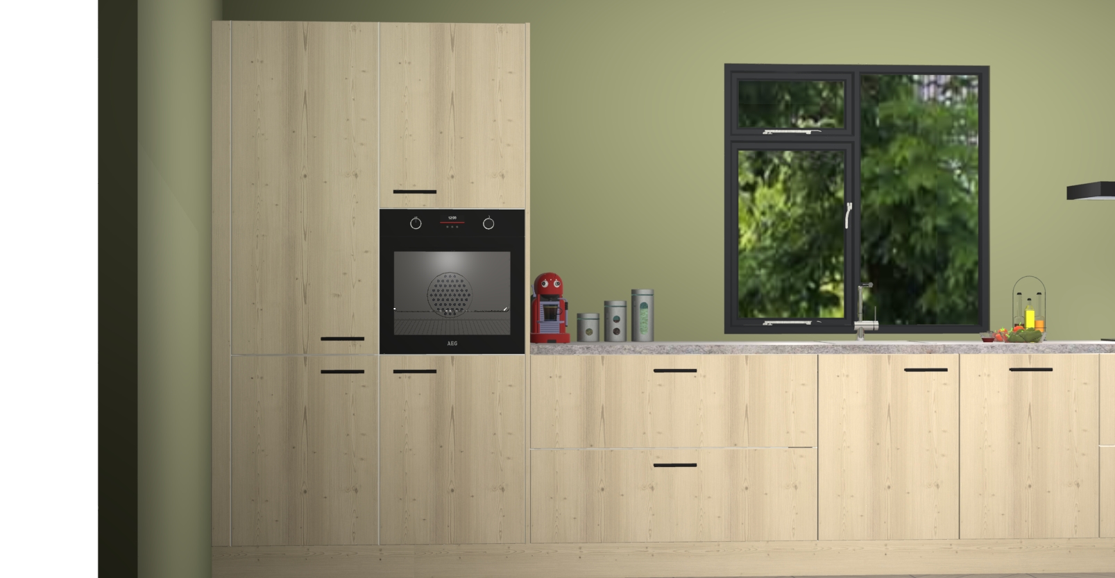 De Olm keuken Lille wordt geleverd met vijf inbouwapparaten - een oven, inductiekookplaat, afzuigkap, vaatwasser en koelkast. Maar dat is nog niet alles! Na bestelling kunnen deze apparaten eenvoudig worden geüpgraded naar premium AEG-apparatuur. Bovendien is er zelfs de optie om de oven te vervangen door een combimagnetron of uw inductiekookplaat te vervangen door een kookplaat met geïntegreerde afzuiging.