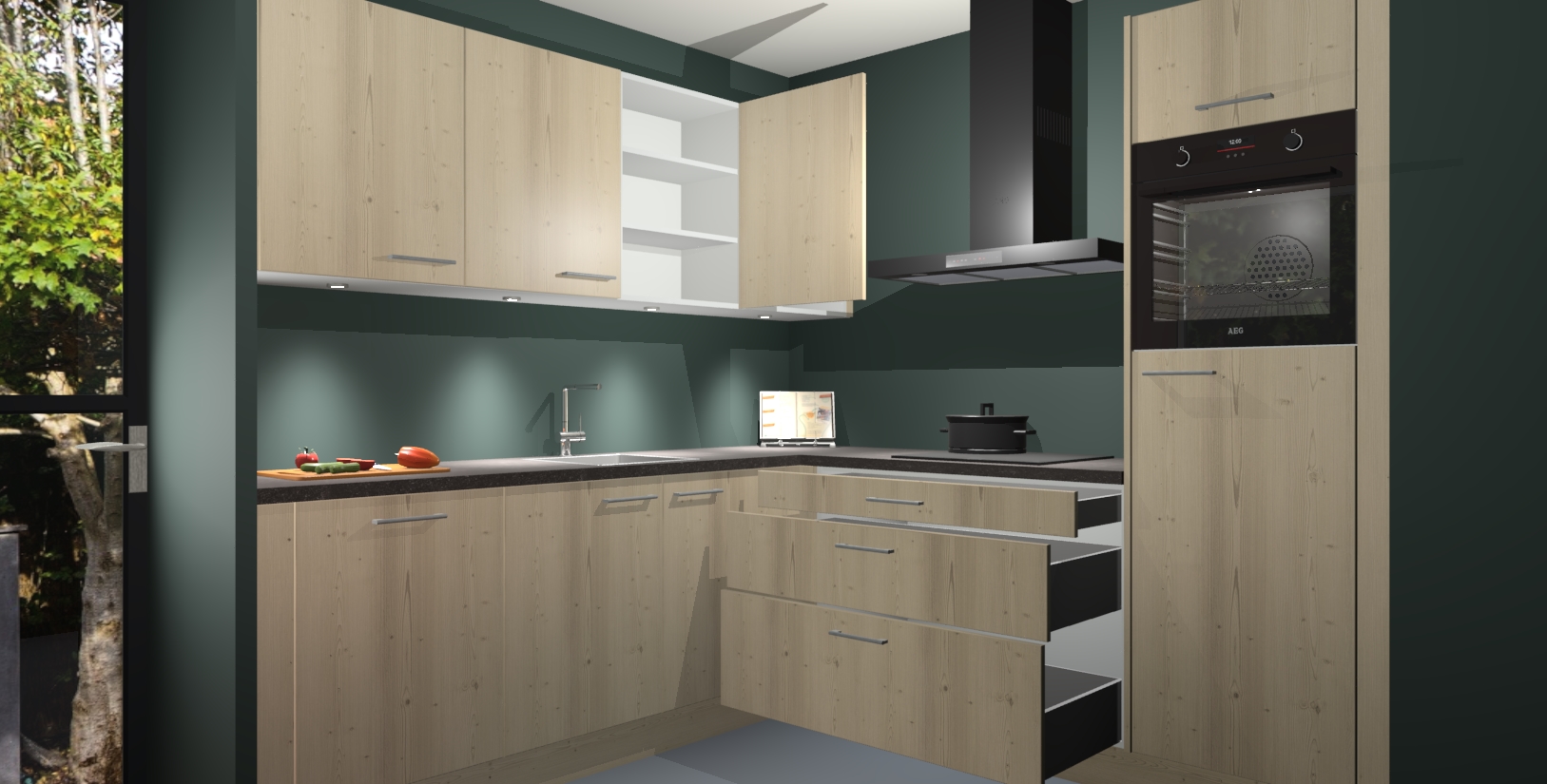 Met een modern, tijdloos design en ruime opslagruimte, zult u zich in no-time thuis voelen in uw nieuwe keuken. Uw leven wordt eenvoudiger met de soft-close deuren die voor het ultieme stille comfort zorgen - geen geluid dat u stoort terwijl u kookt. Ook is de keuken voorzien van 5 ingebouwde apparaten: een oven, inductie kookplaat, afzuigkap, vaatwasser en koelkast. Deze kunnen gemakkelijk na bestelling worden bijgewerkt naar AEG - waardoor uw luxe ervaring compleet is.