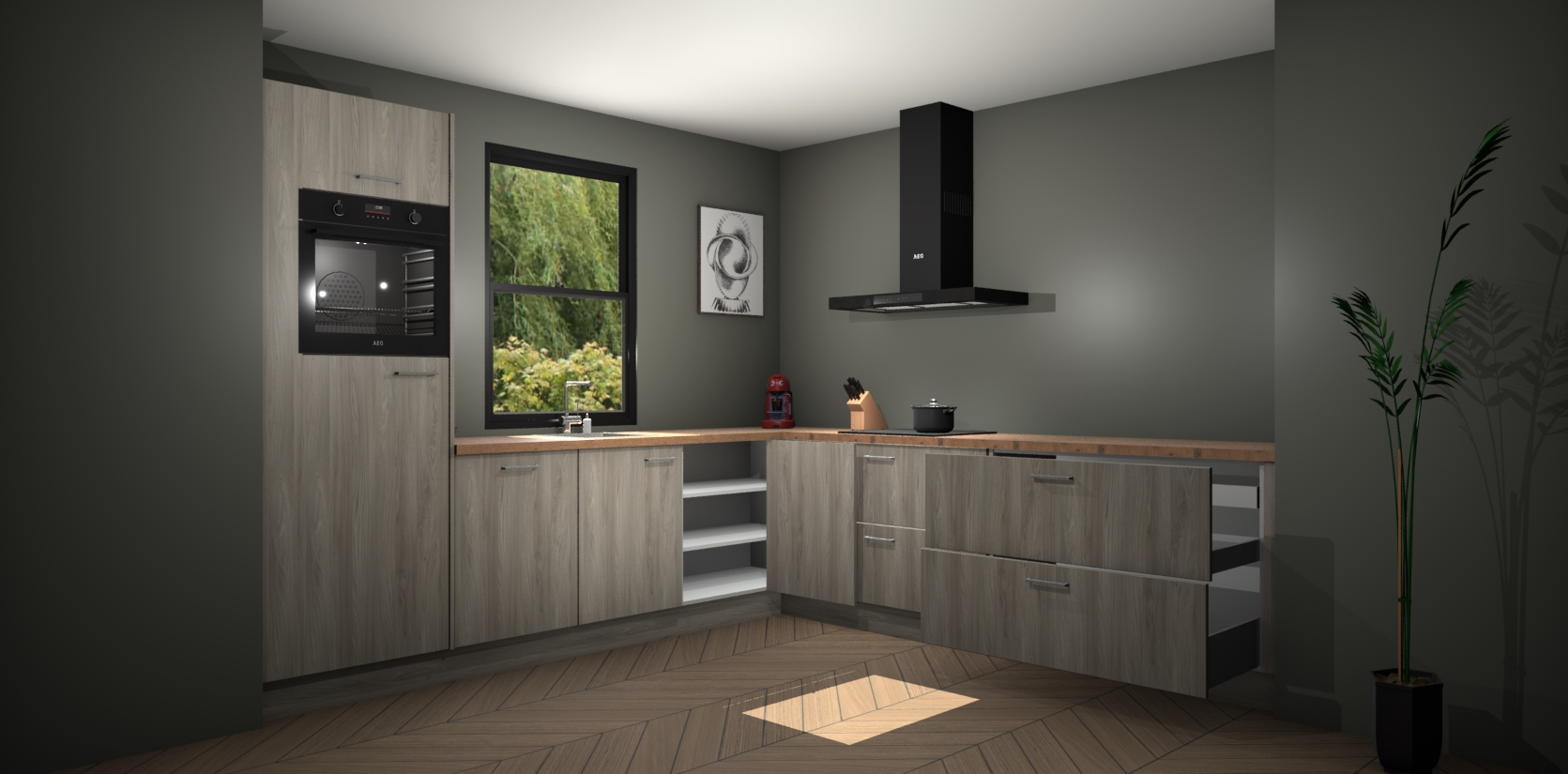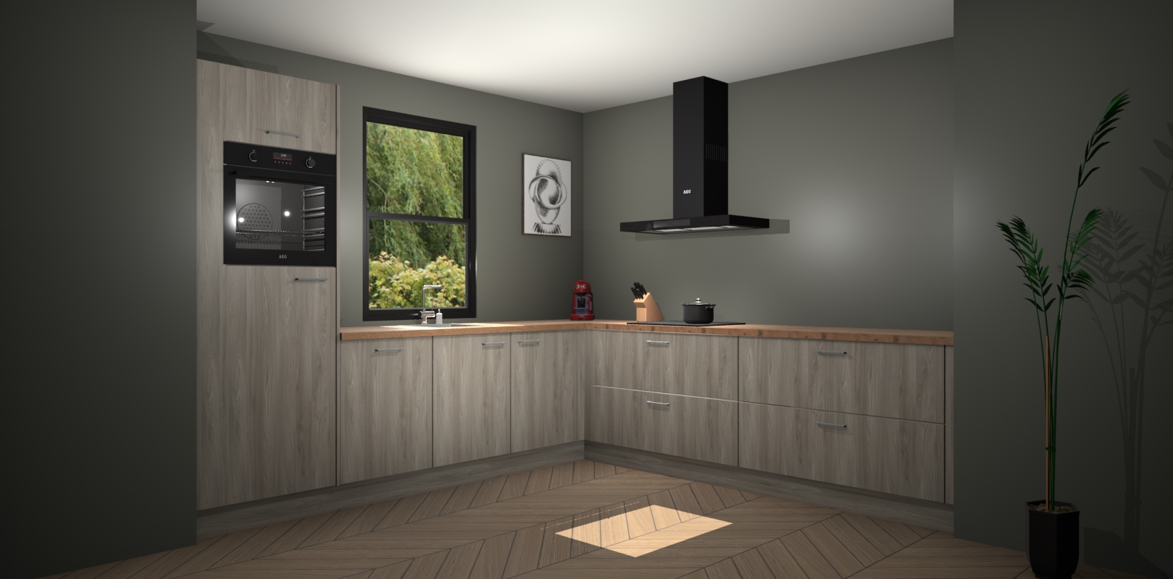 Welkom bij de olm keuken Lublin. Deze prachtige keuken zal de komende jaren het middelpunt van de belangstelling in uw huis zijn. Uitgerust met vijf inbouwapparaten komt u nooit kookgereedschap tekort. Bovendien geeft de warme houtlook elke ruimte een uitnodigende en tijdloze uitstraling.