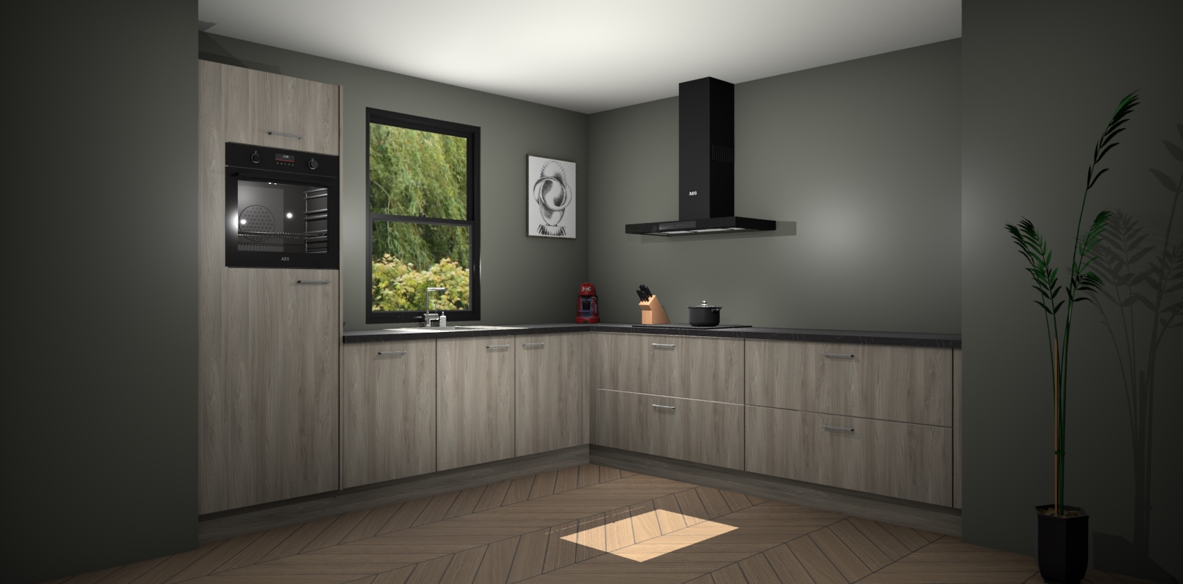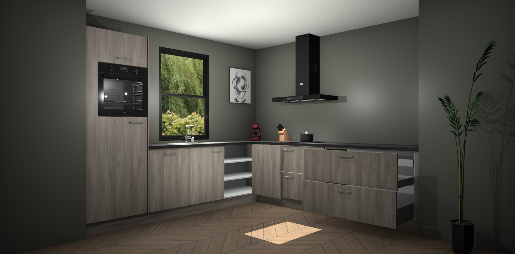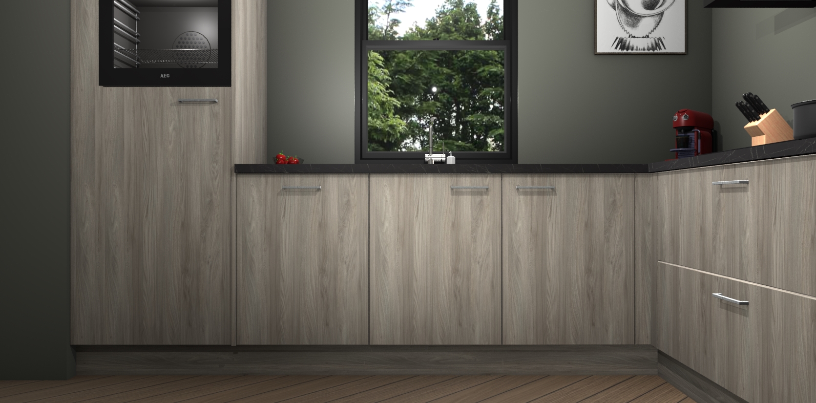 Welkom bij de olm keuken Lublin. Deze prachtige keuken zal de komende jaren het middelpunt van de belangstelling in uw huis zijn. Uitgerust met vijf inbouwapparaten komt u nooit kookgereedschap tekort. Bovendien geeft de warme houtlook elke ruimte een uitnodigende en tijdloze uitstraling.