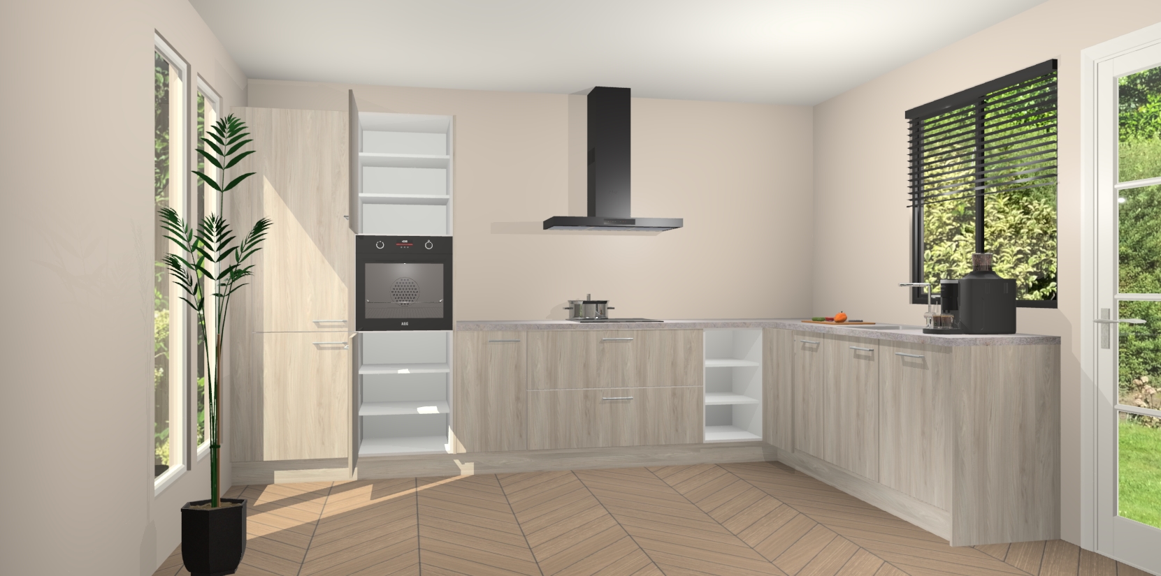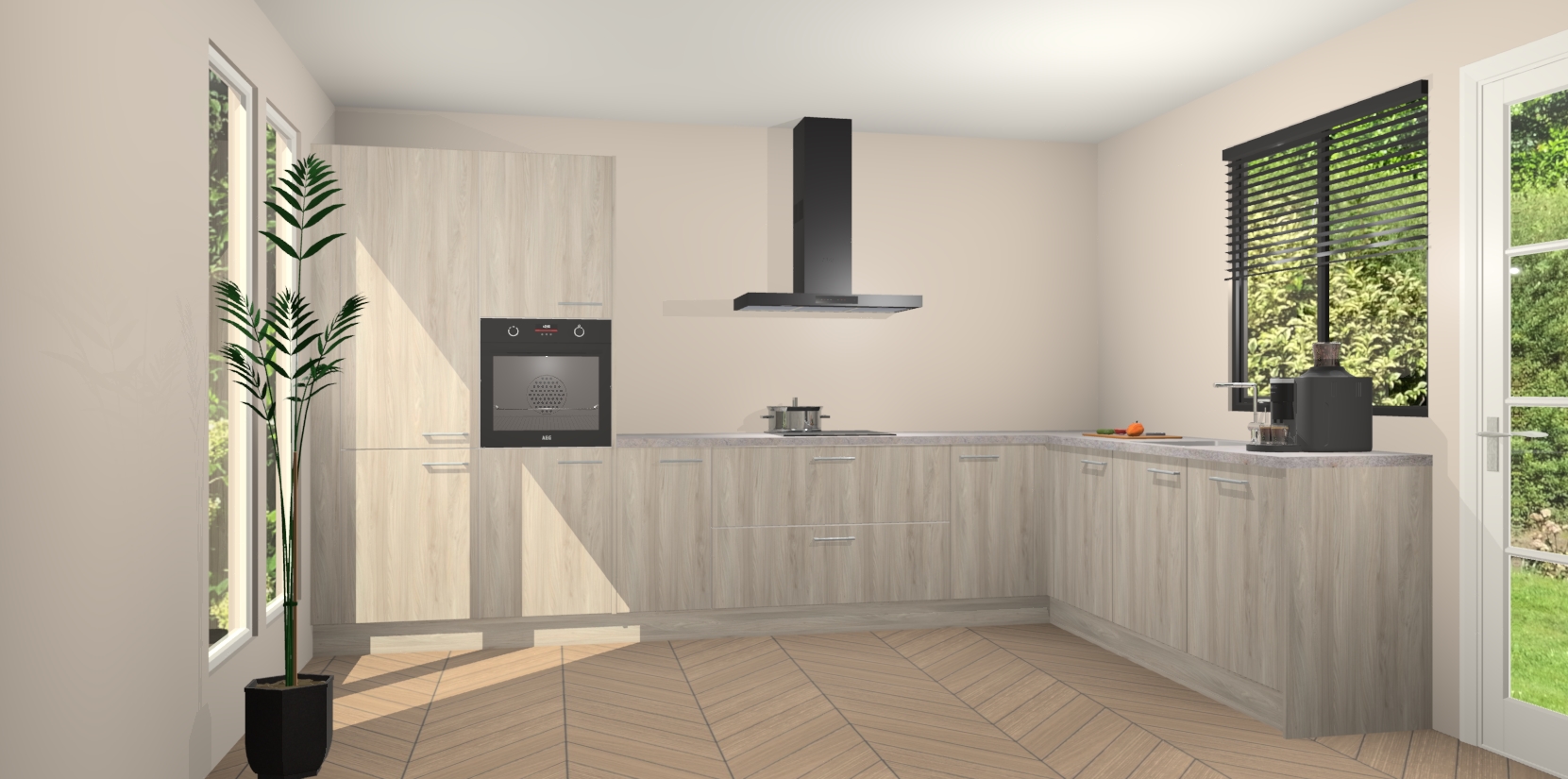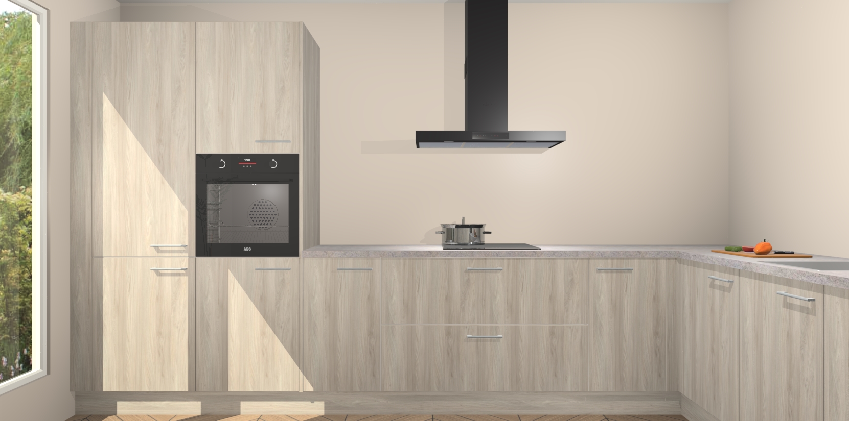 Met een modern, tijdloos design en ruime opslagruimte, zult u zich in no-time thuis voelen in uw nieuwe keuken. Uw leven wordt eenvoudiger met de soft-close deuren die voor het ultieme stille comfort zorgen - geen geluid dat u stoort terwijl u kookt. Ook is de keuken voorzien van 5 ingebouwde apparaten: een oven, inductie kookplaat, afzuigkap, vaatwasser en koelkast. Deze kunnen gemakkelijk na bestelling worden bijgewerkt naar AEG - waardoor uw luxe ervaring compleet is.