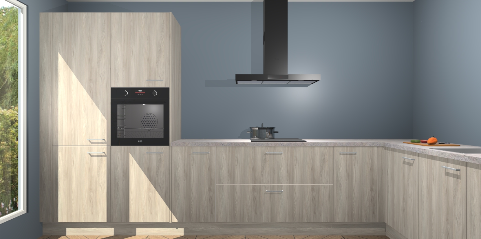 Met een modern, tijdloos design en ruime opslagruimte, zult u zich in no-time thuis voelen in uw nieuwe keuken. Uw leven wordt eenvoudiger met de soft-close deuren die voor het ultieme stille comfort zorgen - geen geluid dat u stoort terwijl u kookt. Ook is de keuken voorzien van 5 ingebouwde apparaten: een oven, inductie kookplaat, afzuigkap, vaatwasser en koelkast. Deze kunnen gemakkelijk na bestelling worden bijgewerkt naar AEG - waardoor uw luxe ervaring compleet is.