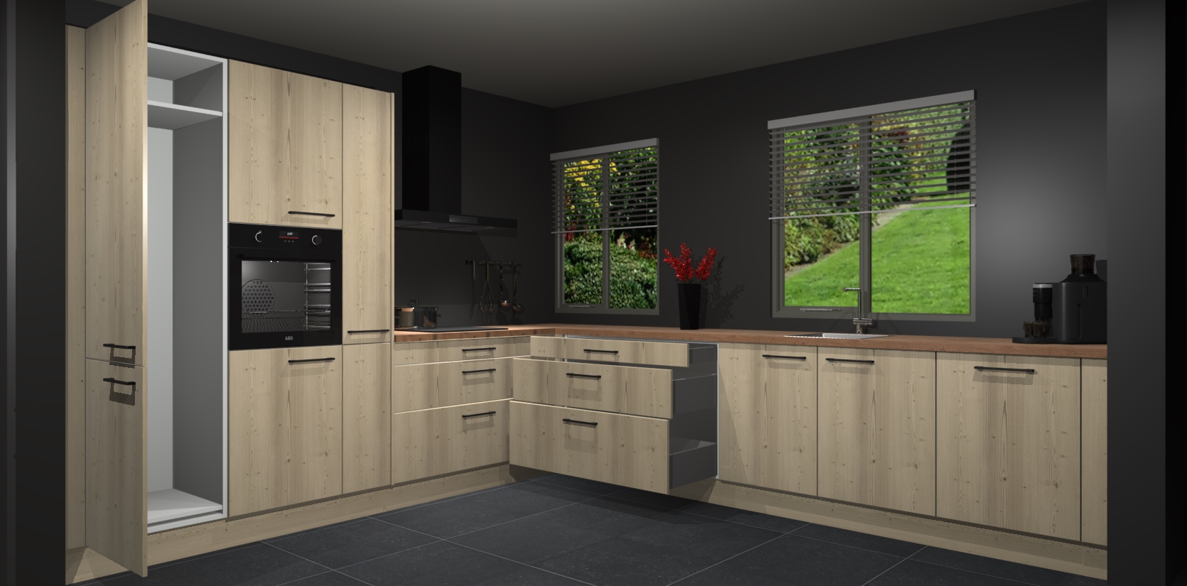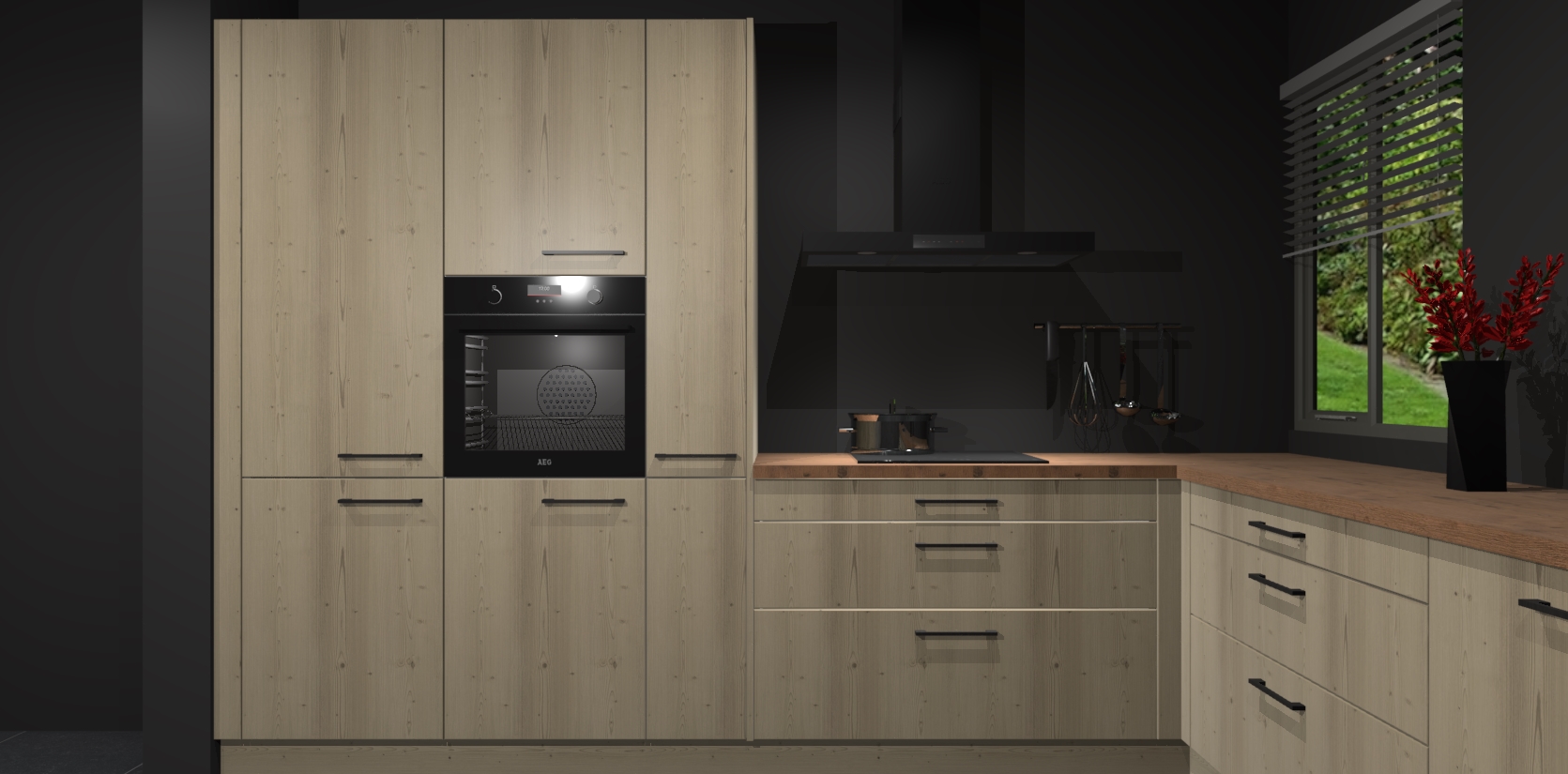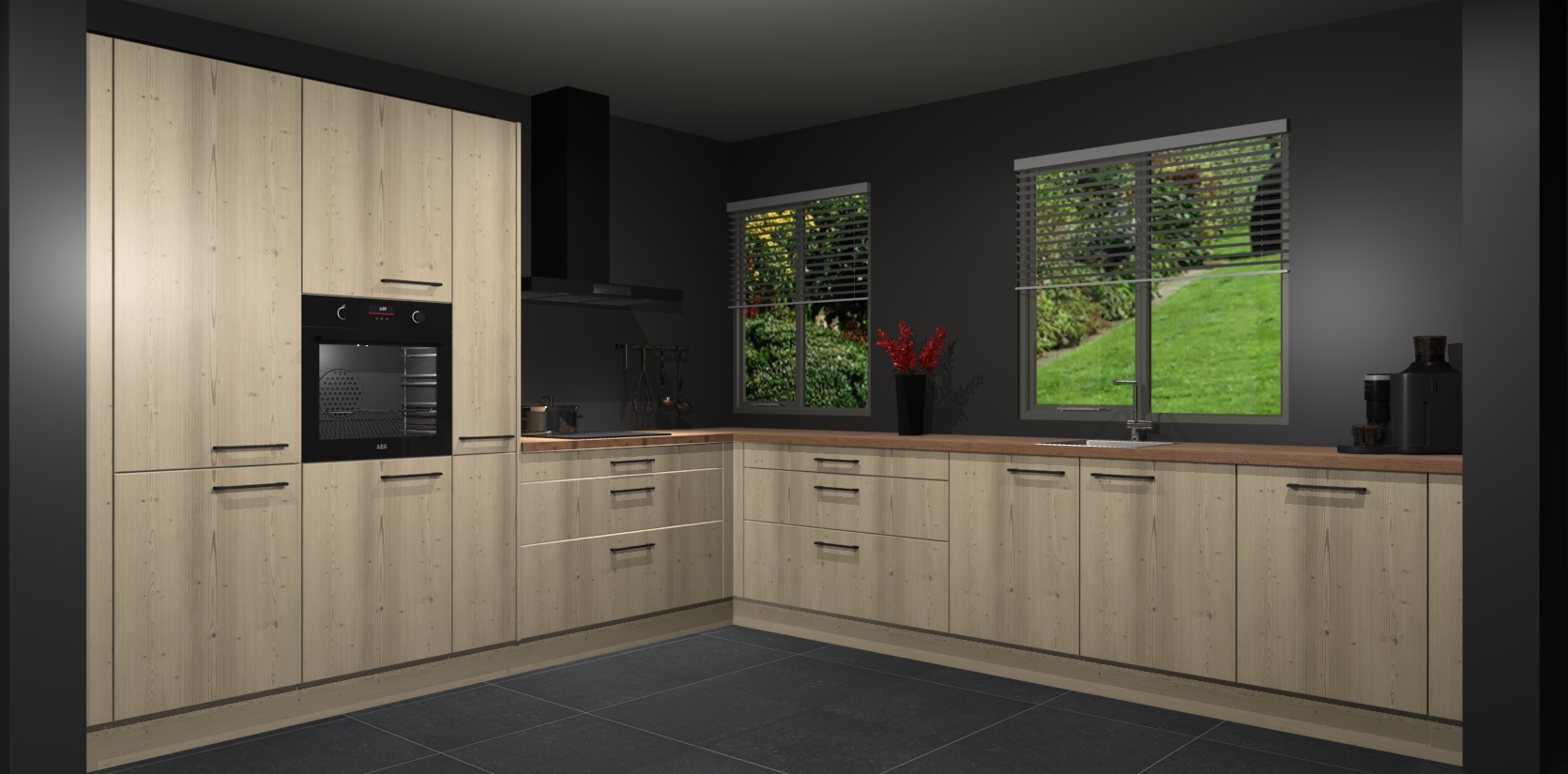 Welkom bij de Olm keuken Palermo. Deze prachtige keuken zal de komende jaren het middelpunt van de belangstelling in uw huis zijn. Uitgerust met vijf inbouwapparaten komt u nooit kookgereedschap tekort. Bovendien geeft de warme houtlook elke ruimte een uitnodigende en tijdloze uitstraling.