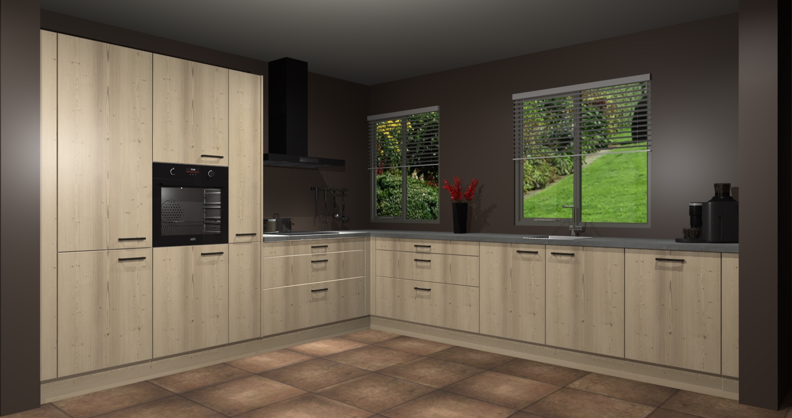 Welkom bij de Olm keuken Palermo. Deze prachtige keuken zal de komende jaren het middelpunt van de belangstelling in uw huis zijn. Uitgerust met vijf inbouwapparaten komt u nooit kookgereedschap tekort. Bovendien geeft de warme houtlook elke ruimte een uitnodigende en tijdloze uitstraling.
