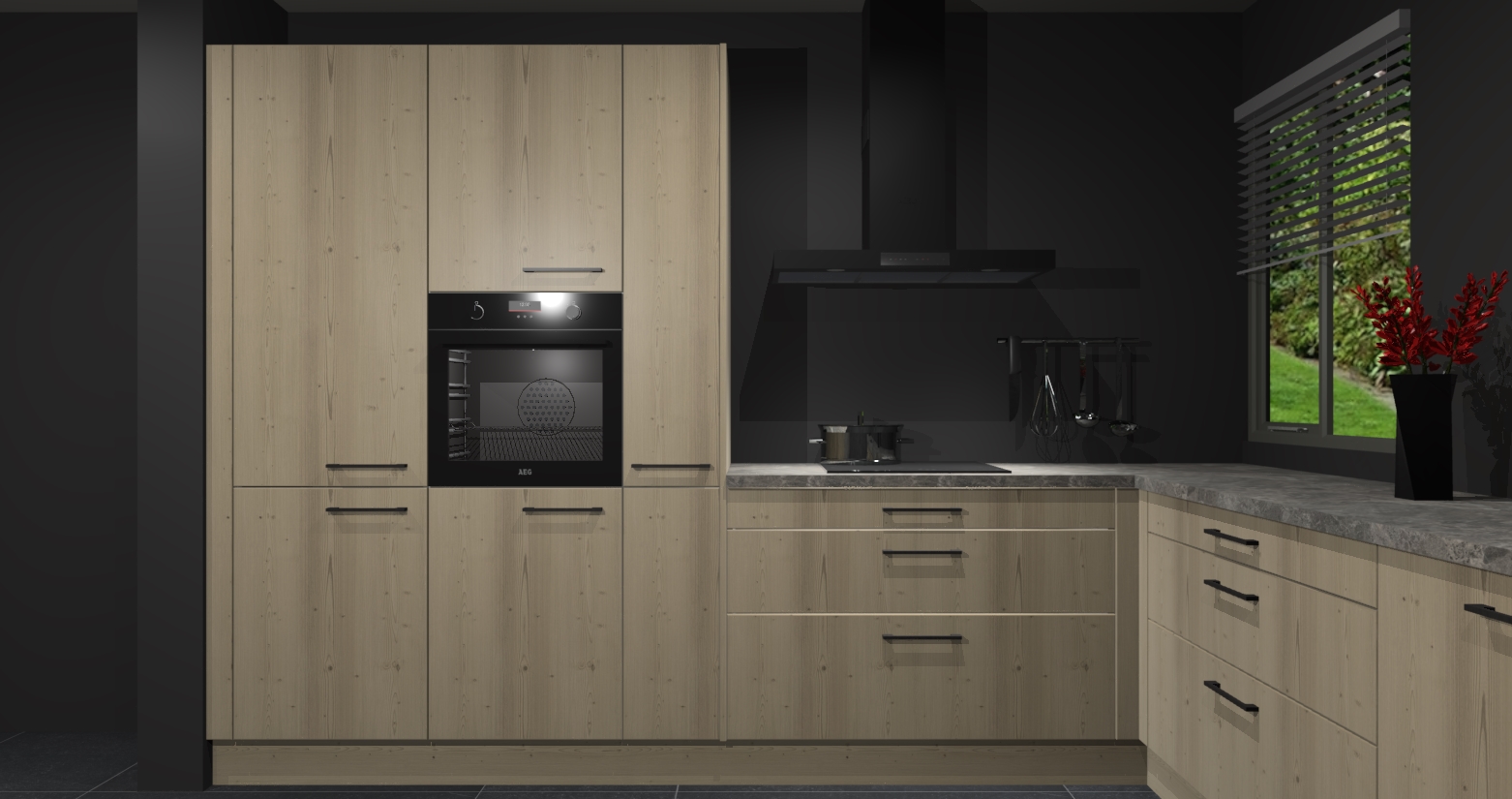 Welkom bij de Olm keuken Palermo. Deze prachtige keuken zal de komende jaren het middelpunt van de belangstelling in uw huis zijn. Uitgerust met vijf inbouwapparaten komt u nooit kookgereedschap tekort. Bovendien geeft de warme houtlook elke ruimte een uitnodigende en tijdloze uitstraling.